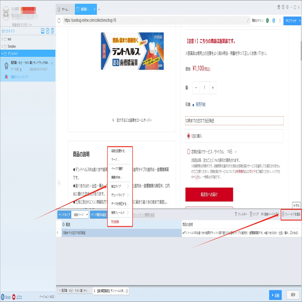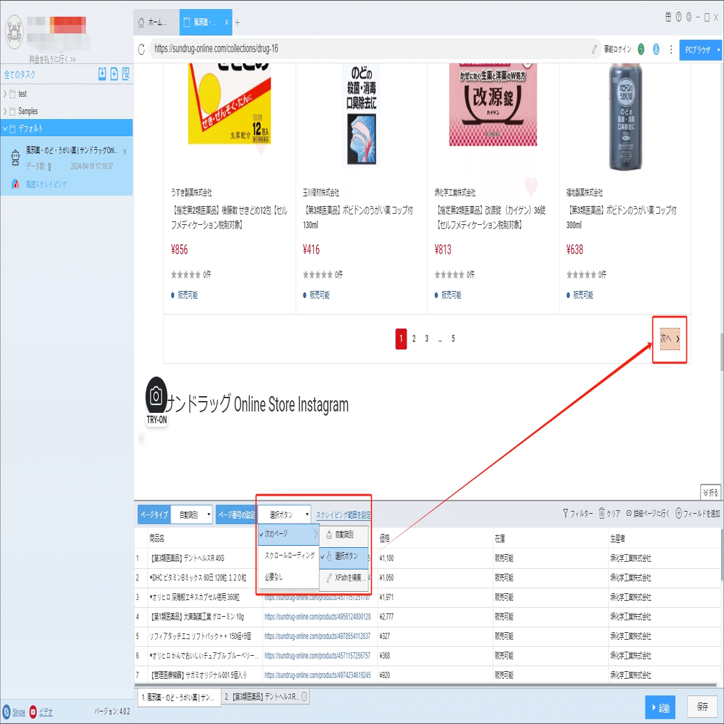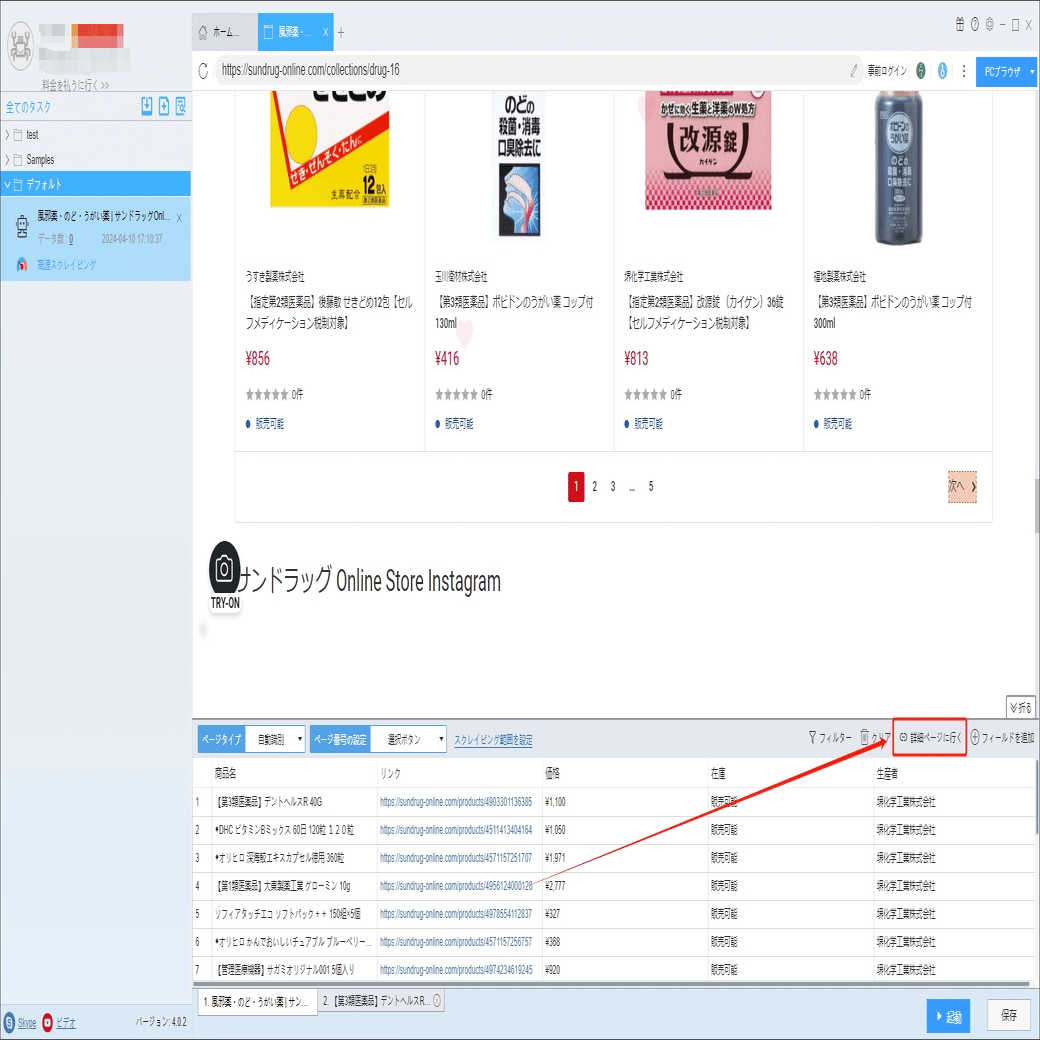 配送、サイズ、商品の説明などの情報は詳細ページに付いていますから、ソフトウェアの「詳細ページに行く」機能を利用して、データを抽出します。