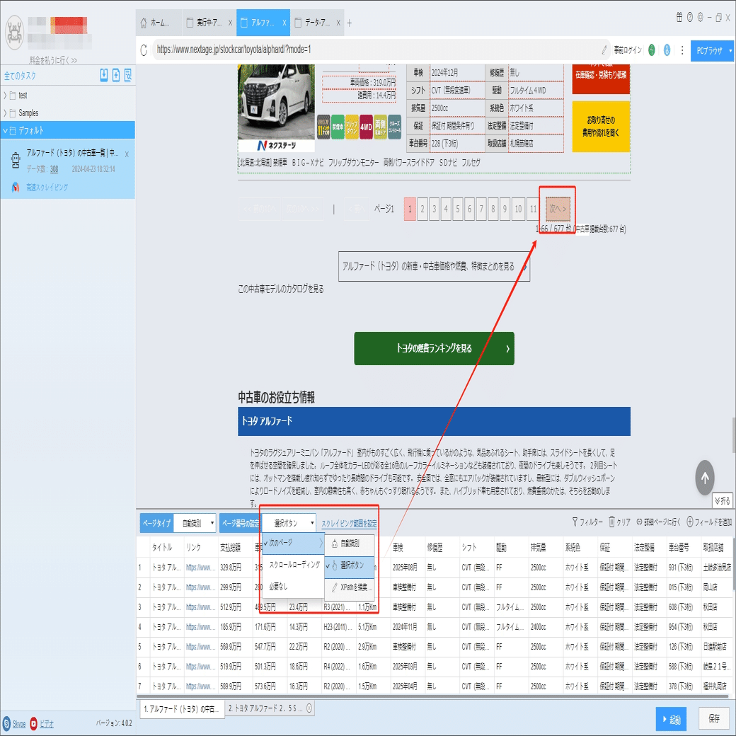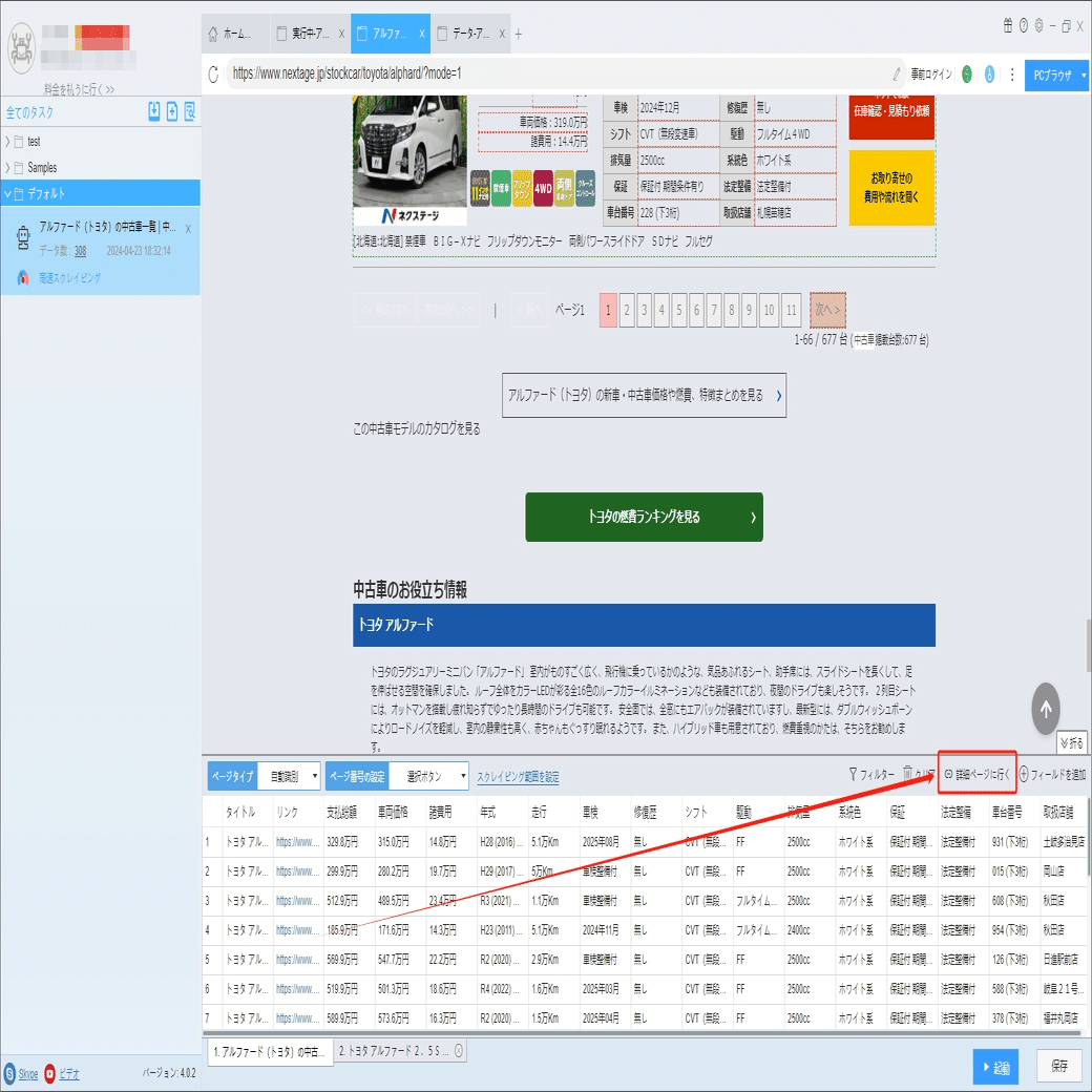 禁煙車、発売年月などの詳細情報は詳細ページに付いていますから、ソフトウェアの「詳細ページに行く」機能を利用して、データを抽出します。