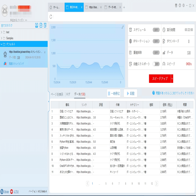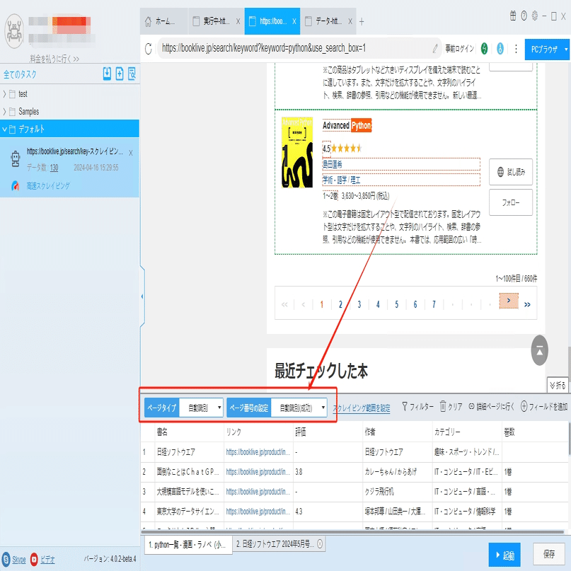 価格、書籍内容などの詳細情報は詳細ページに付いていますから、ソフトウェアの「詳細ページに行く」機能を利用して、データを抽出します。