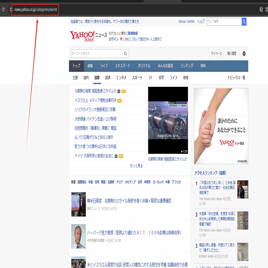 今回は国際ニュース一覧ページを例として、そのスクレイピング方法を紹介します。まず、URLをコピーしてください。