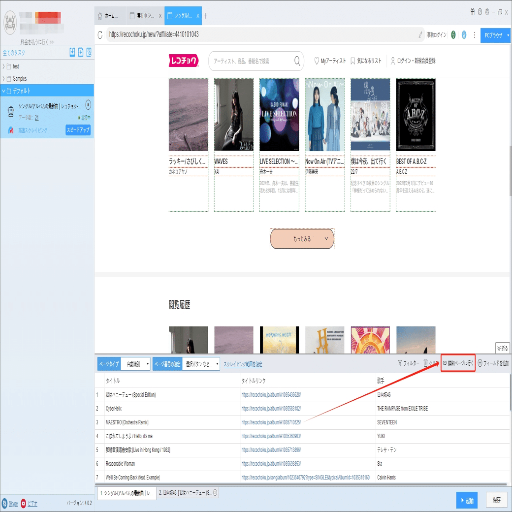 再生時間、曲数、価格などの詳細情報は詳細ページに付いていますから、ソフトウェアの「詳細ページに行く」機能を利用して、データを抽出します。