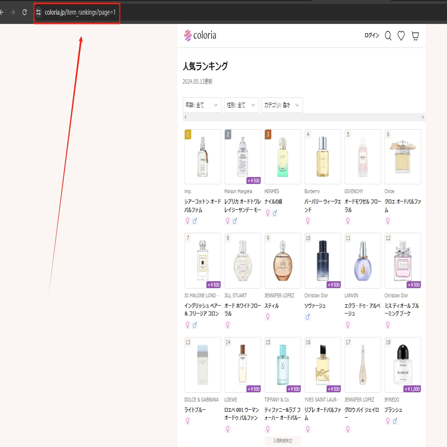 今回は香水の人気ランキング一覧ページから香水の情報を収得し、そのスクレイピング方法を紹介します。まず、第二ページのリンクをコピーしてください。