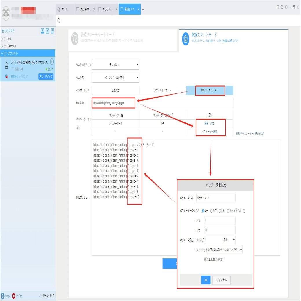 URLジェネレータでURLを入力して、パラメーターを追加画面にページ数を入力し、生成したURLはプレビュー画面でチェックしてください。