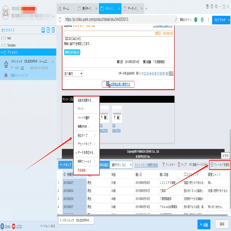 「フィールドを追加」ボタンをクリックして、画面に必要な要素を選択、データが自動的に抽出されます。また、必要に応じてフィールドの名前の変更または削除、結合できます。