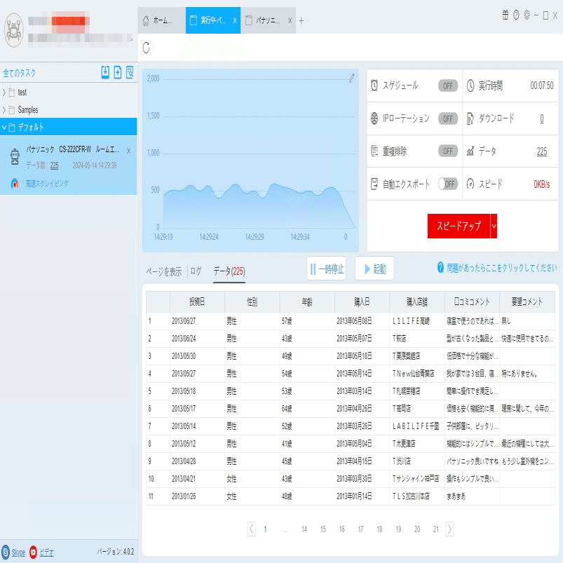 必要に応じて、スケジュール、アンチブロック、自動エクスポート、写真のダウンロード、スピードブーストを設定できます。サーバーに負荷しないように、遅延時間を設定してください。5秒以上を推薦します。スクレイピングタスクを配置する方法については、下記のチュートリアルをご参照ください。