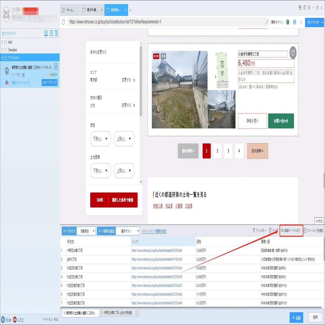 ソフトウェアの「詳細ページに行く」機能を利用し、建ぺい率、容積率、土地面積などの情報を抽出します。