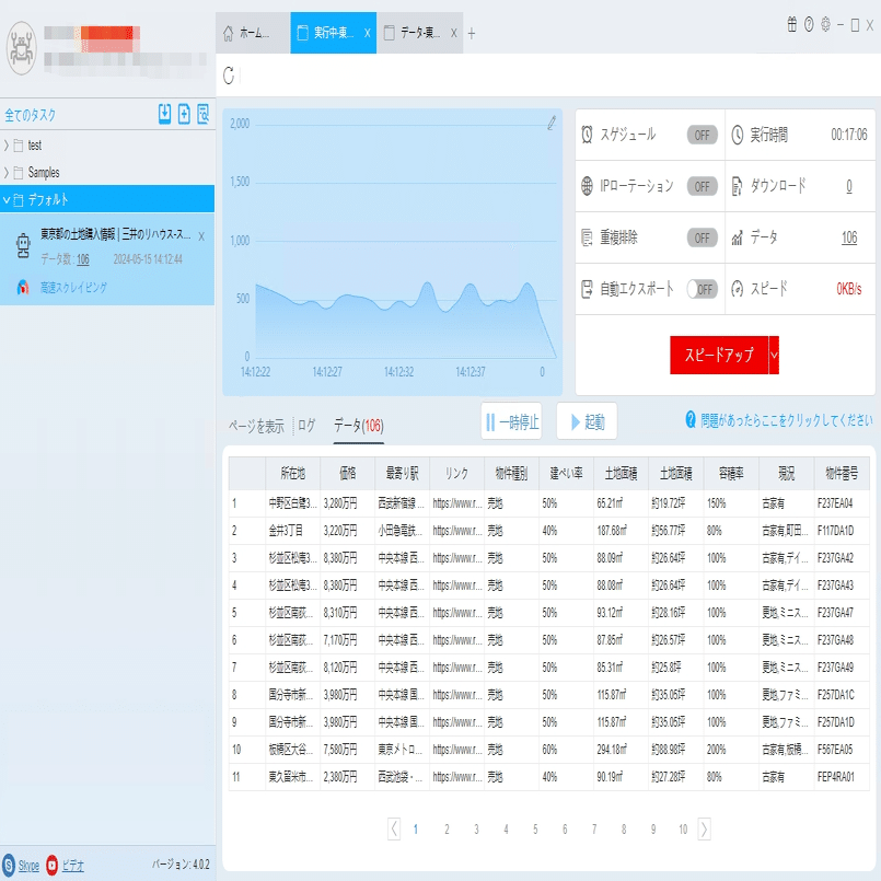 必要に応じて、スケジュール、アンチブロック、自動エクスポート、写真のダウンロード、スピードブーストを設定できます。サーバーに負荷しないように、遅延時間を設定してください。5秒以上を推薦します。スクレイピングタスクを配置する方法については、下記のチュートリアルをご参照ください。
