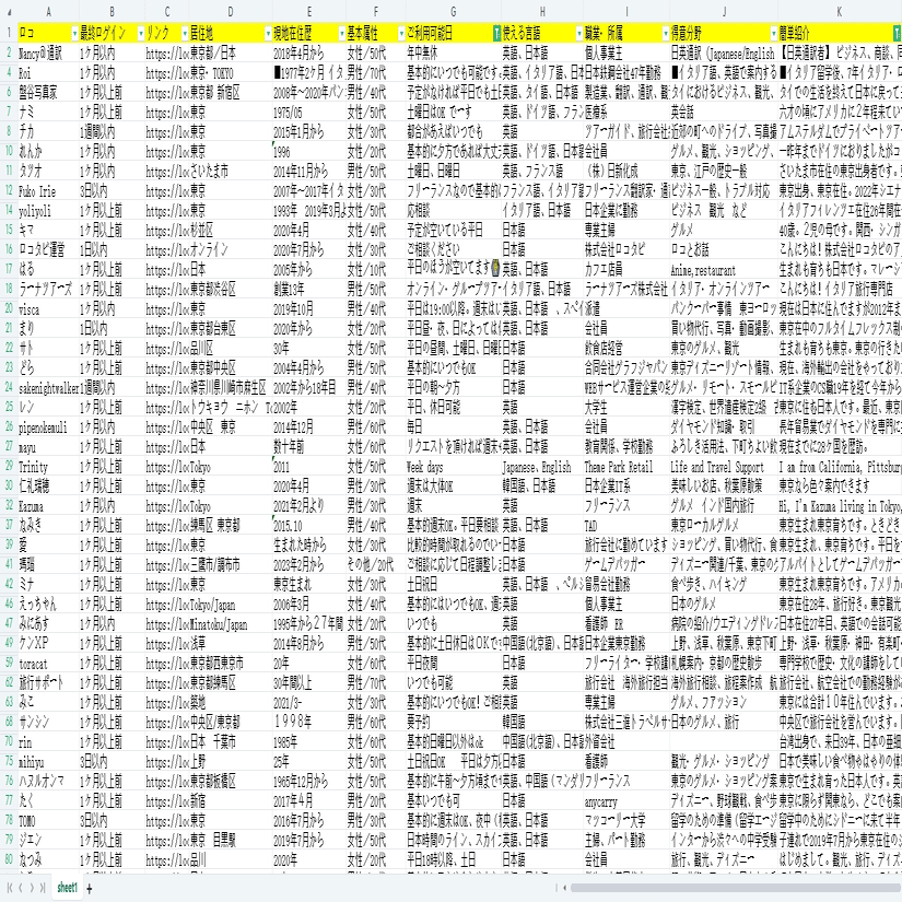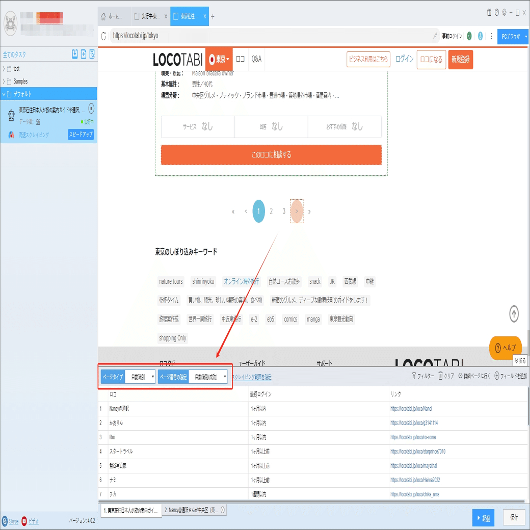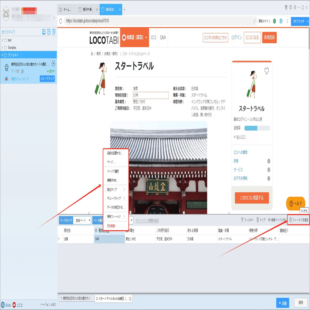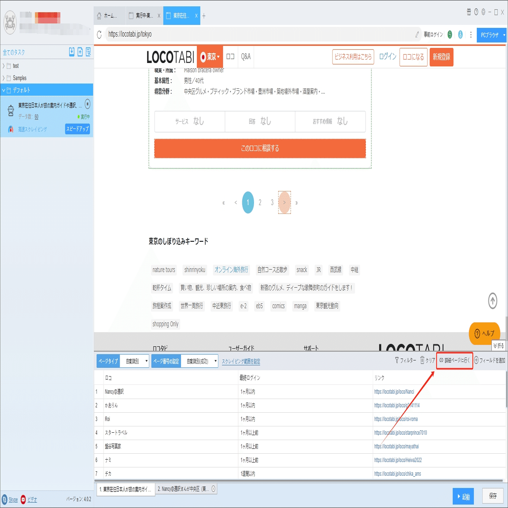 ソフトウェアの「詳細ページに行く」機能を利用し、現地在住歴、ご利用可能日、得意分野などの情報を抽出します。
