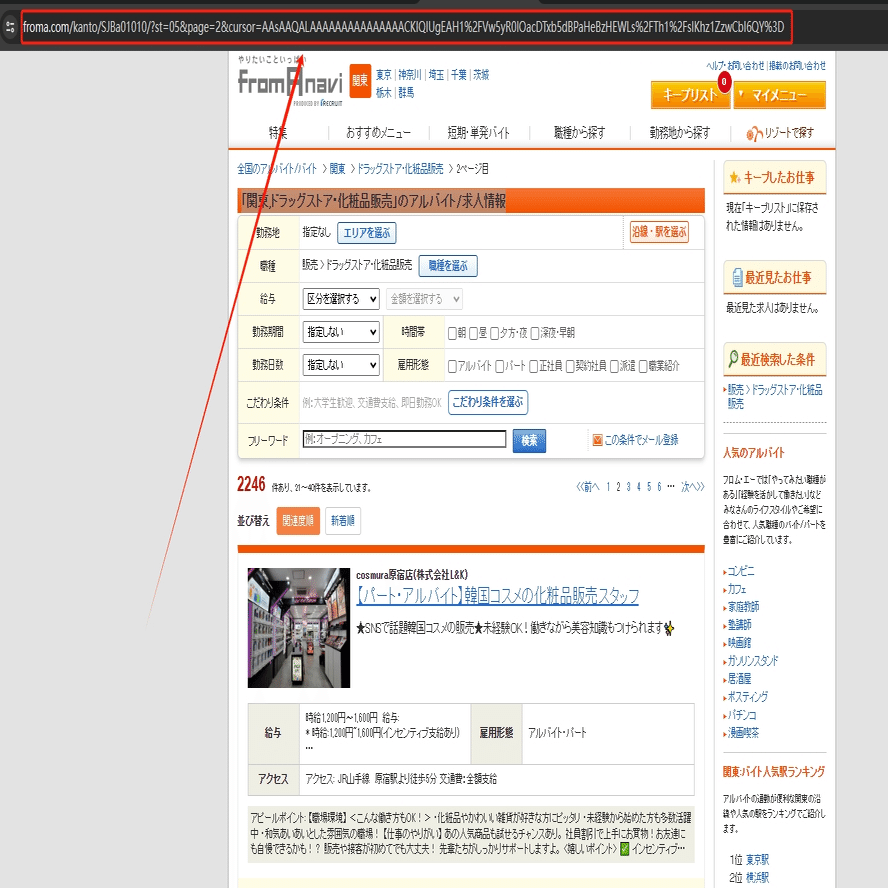 今回は「関東,ドラッグストア・化粧品販売」のアルバイト/求人情報一覧ページから求人情報を収得し、そのスクレイピング方法を紹介します。まず、第二ページのリンクをコピーしてください。
