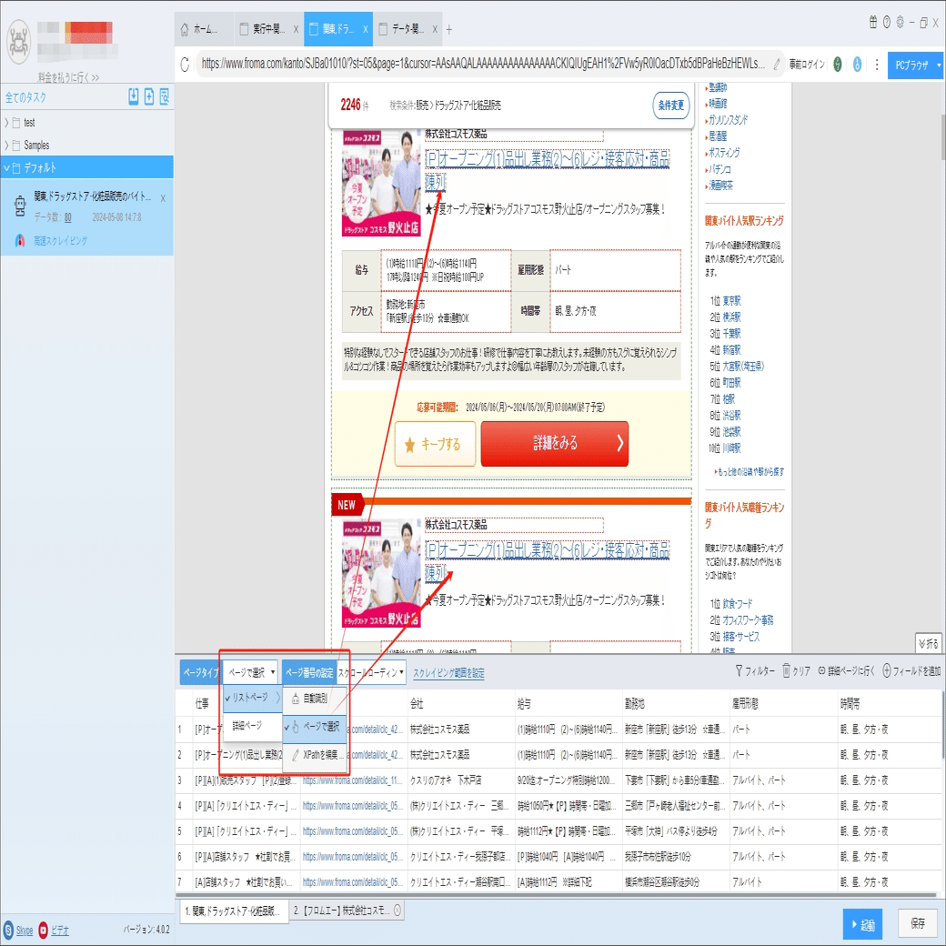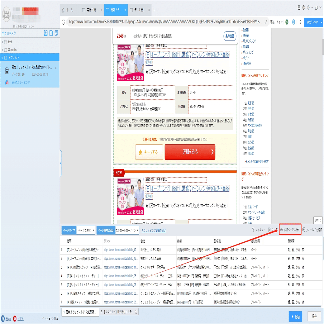 ソフトウェアの「詳細ページに行く」機能を利用し、時給詳細、仕事内容、資格などの情報を抽出します。