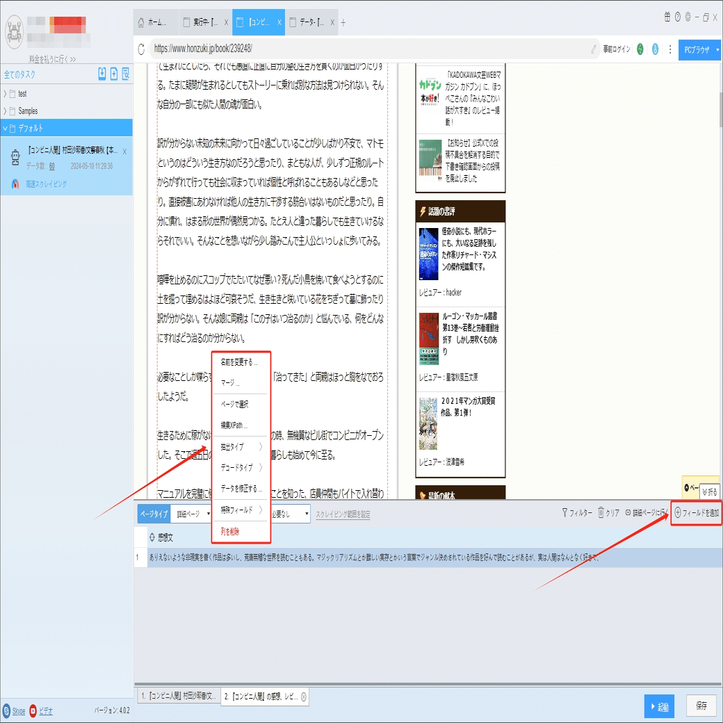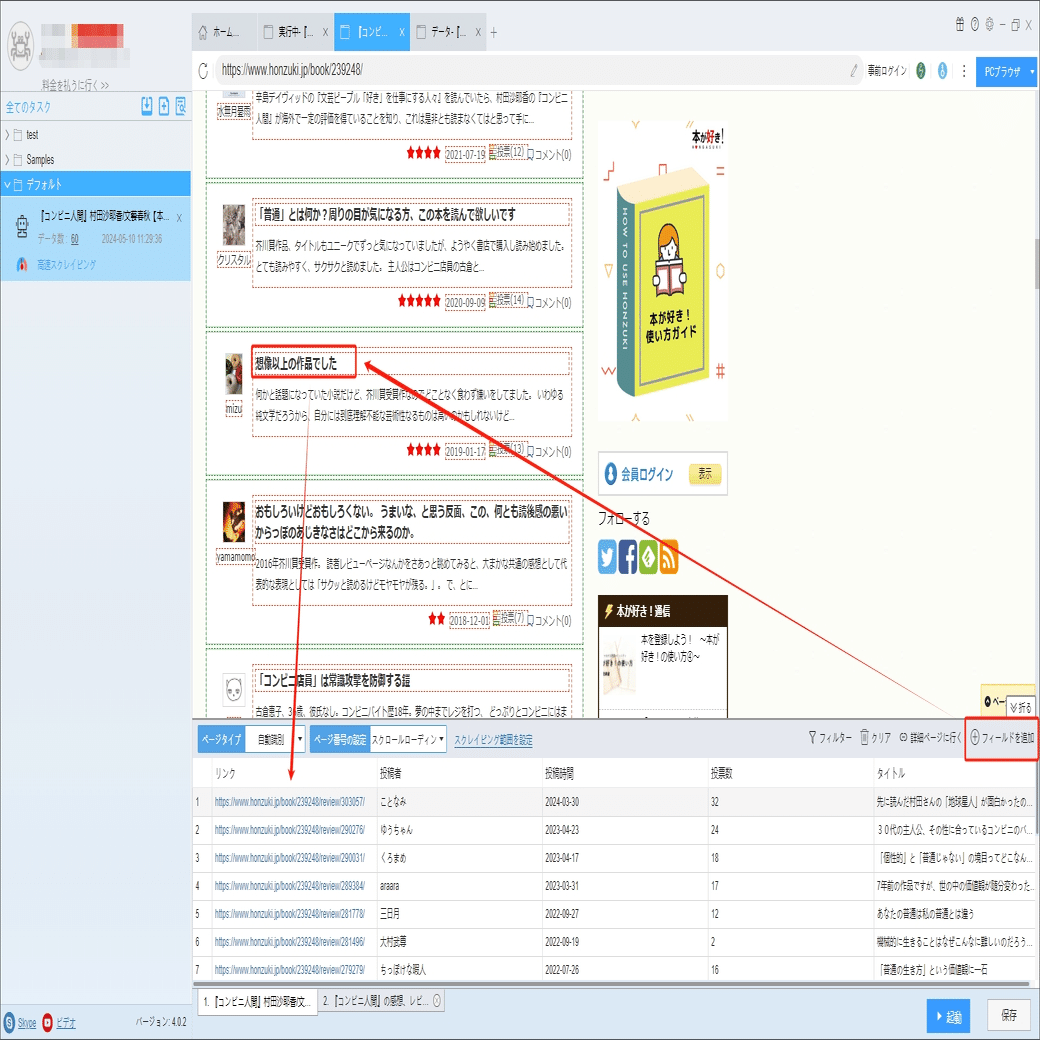 「フィールドを追加」機能を利用して、感想文のタイトルをクリックし、ソフトウェアは自動的に詳細ページのリンクを抽出します。そして、抽出されたリンクをクリック、詳細ページを開けます。