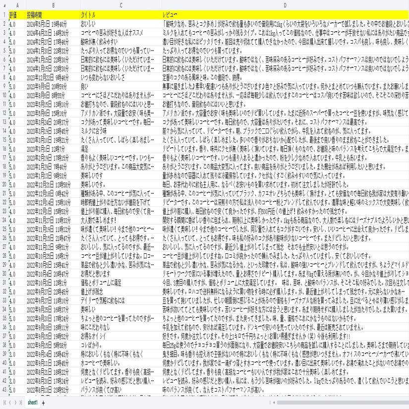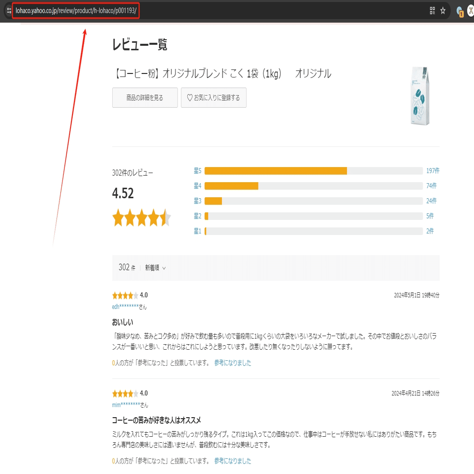 今回はある人気コーヒー粉のレビューをスクレイピングする方法を紹介します。まず、URLをコピーしてください。