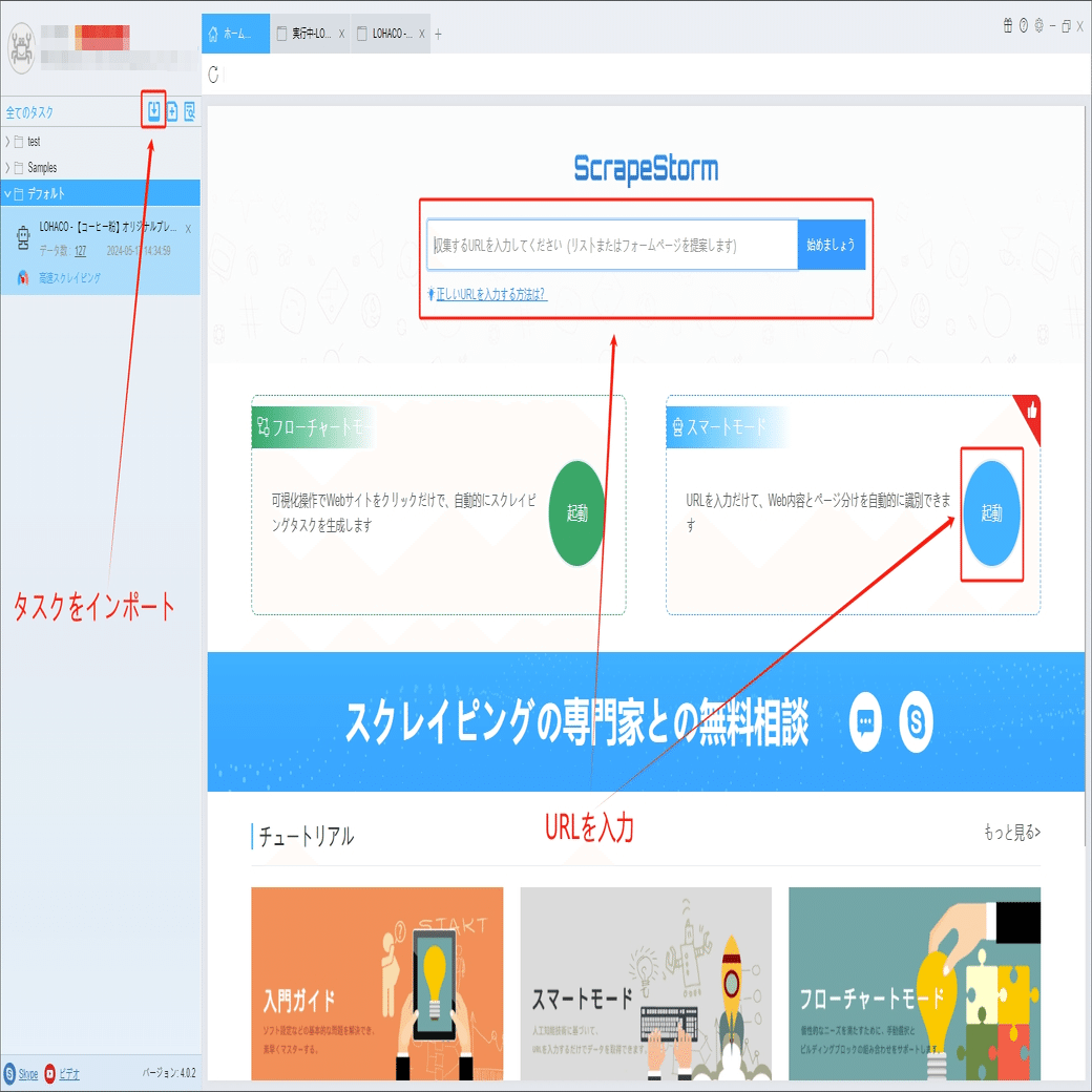 ScrapeStormのホムページ画面にスマートモードタスクを新規作成します。また、持っているタスクをインポートすることもできます。