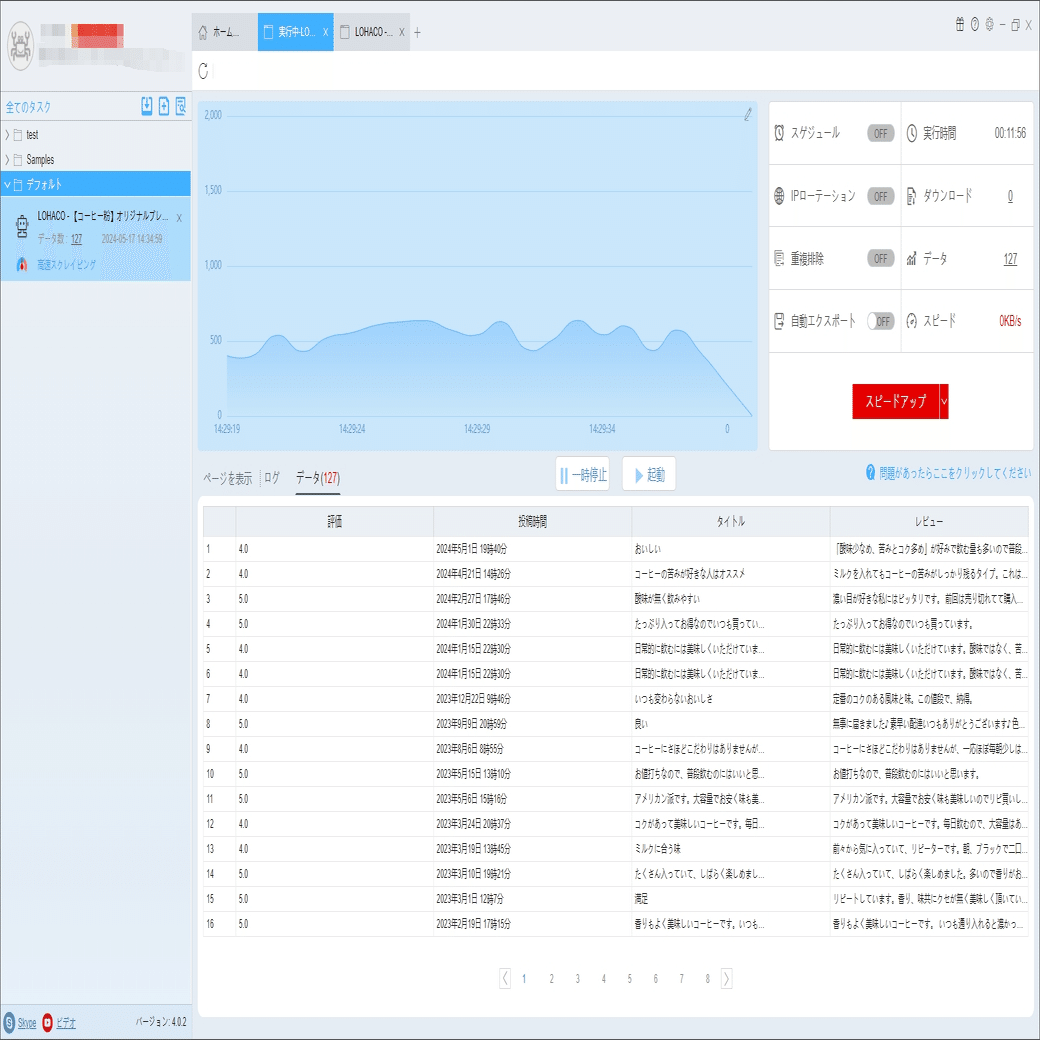 必要に応じて、スケジュール、アンチブロック、自動エクスポート、写真のダウンロード、スピードブーストを設定できます。サーバーに負荷しないように、遅延時間を設定してください。5秒以上を推薦します。スクレイピングタスクを配置する方法については、下記のチュートリアルをご参照ください。
