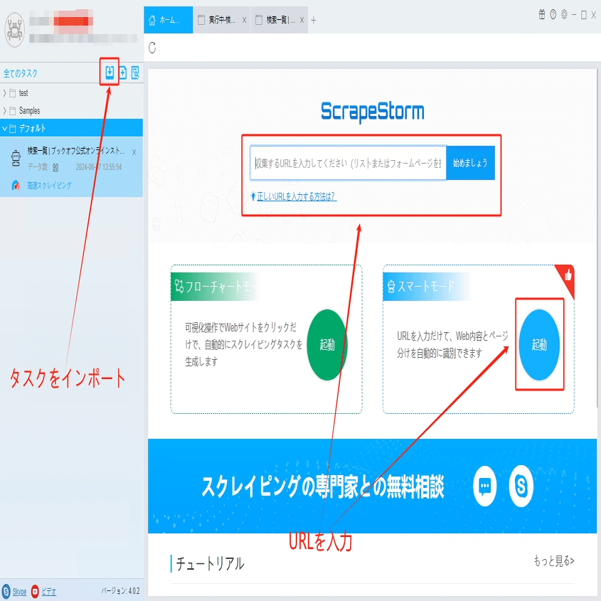 ScrapeStormのホームページ画面にスマートモードタスクを新規作成します。また、持っているタスクをインポートすることもできます。