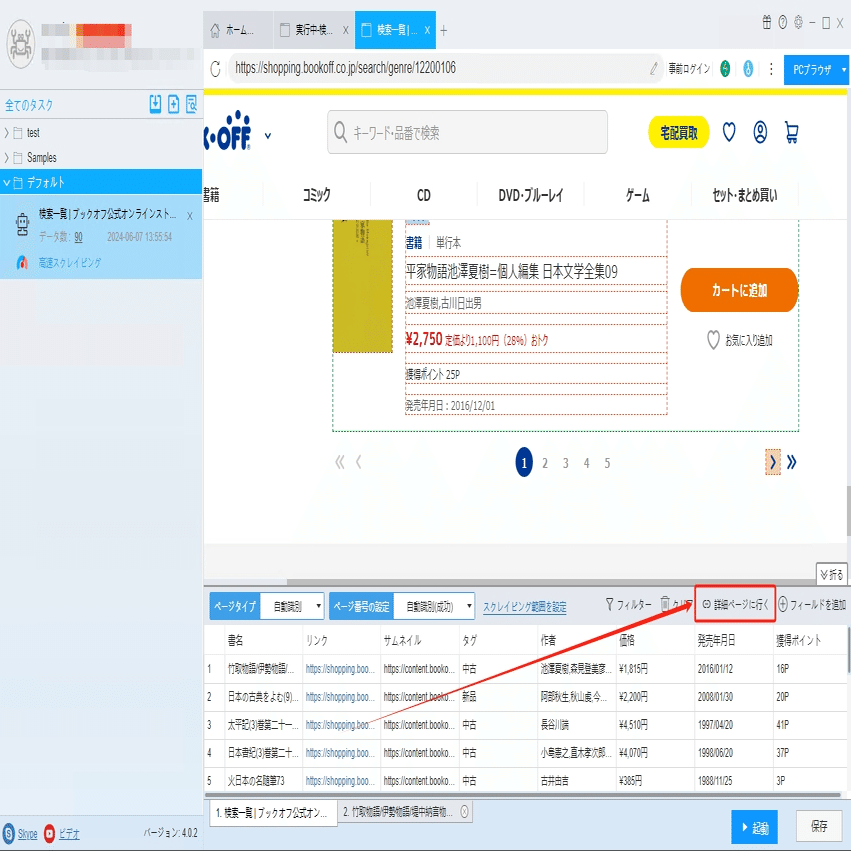 ソフトウェアの「詳細ページに行く」機能を利用し、販売会社/発売会社、JANコード、在庫などの情報を抽出します。