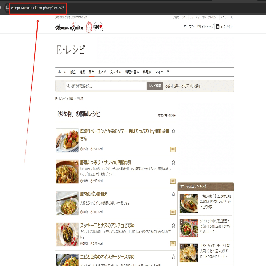 今回は「炒め物」の簡単レシピ一覧ページをスクレイピングする方法を紹介します。まず、URLをコピーしてください。