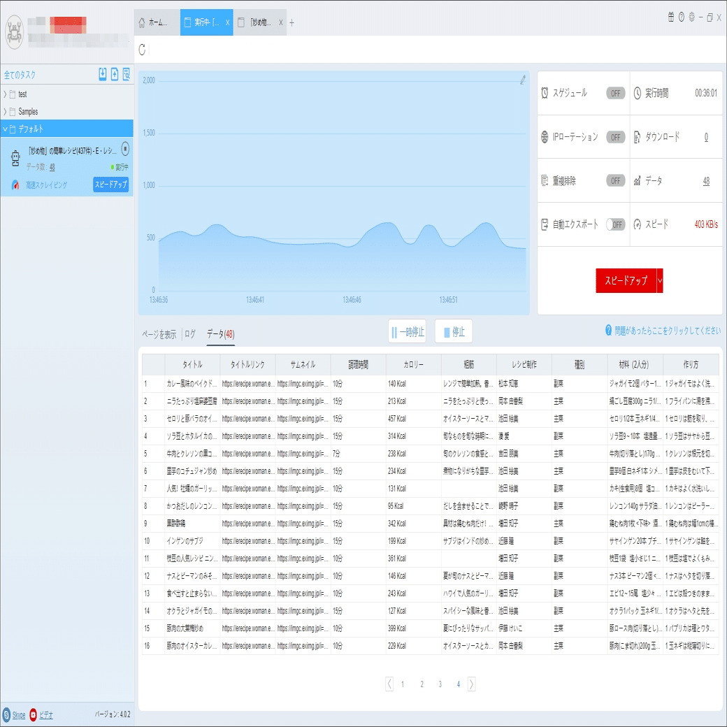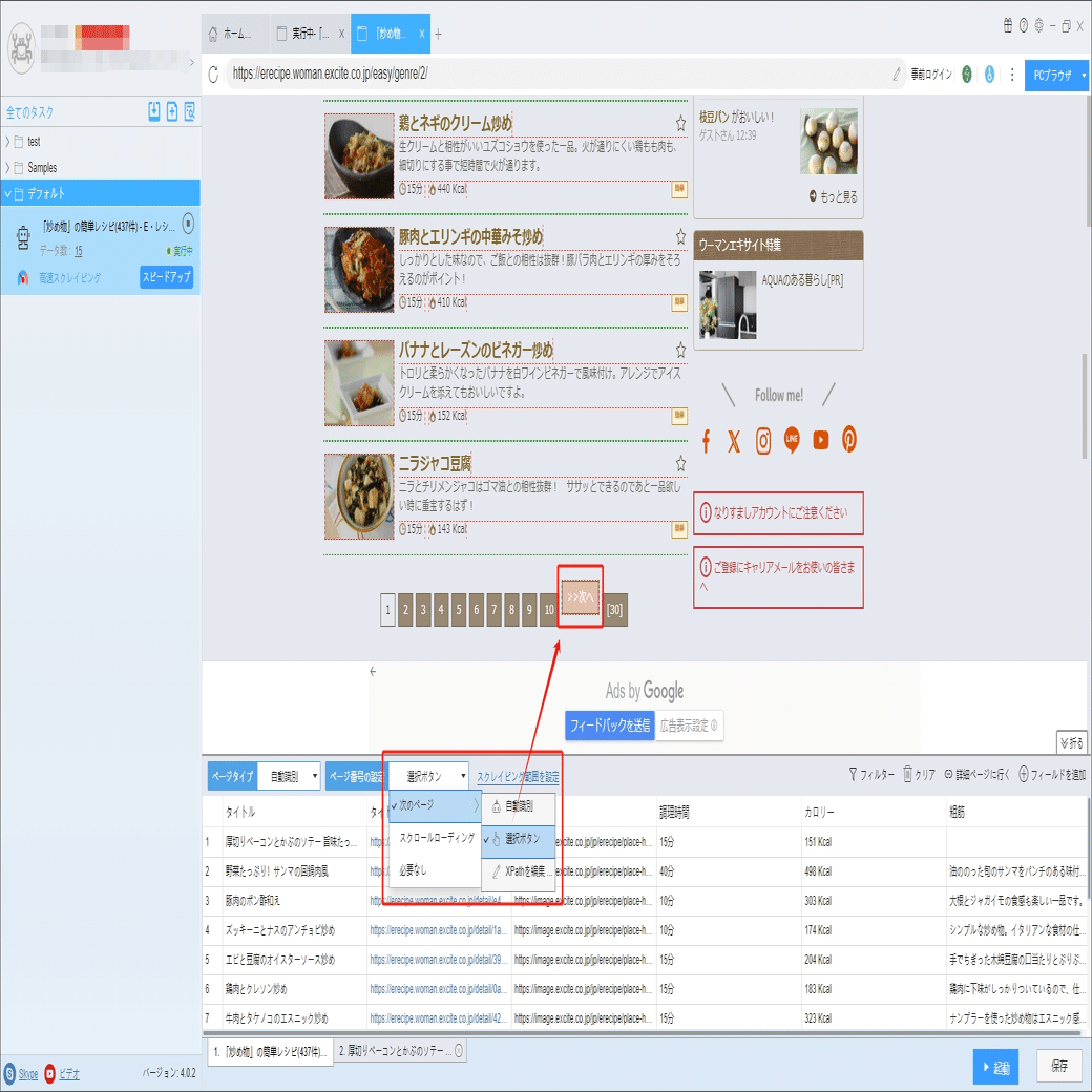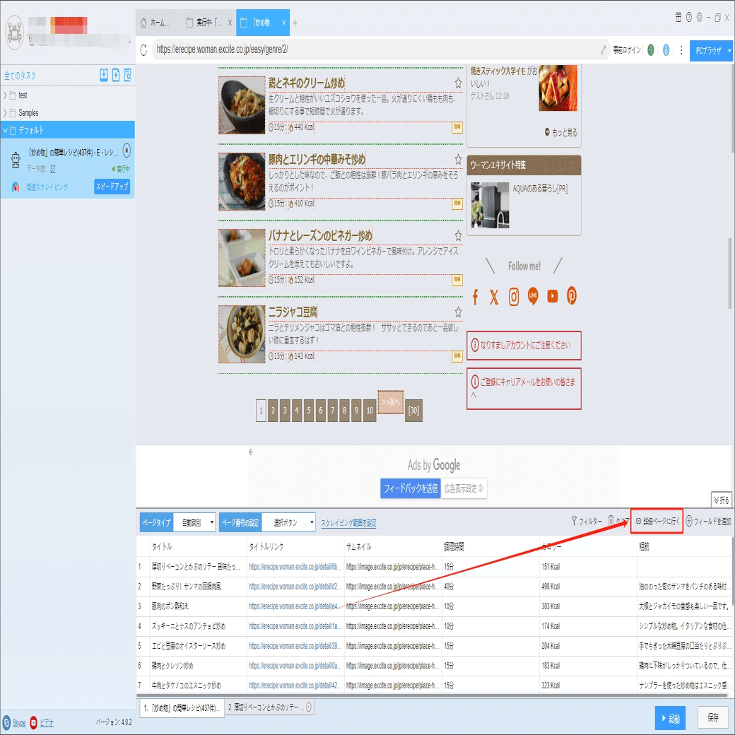 ソフトウェアの「詳細ページに行く」機能を利用し、材料、作り方、レシピ作者などの情報を抽出します。