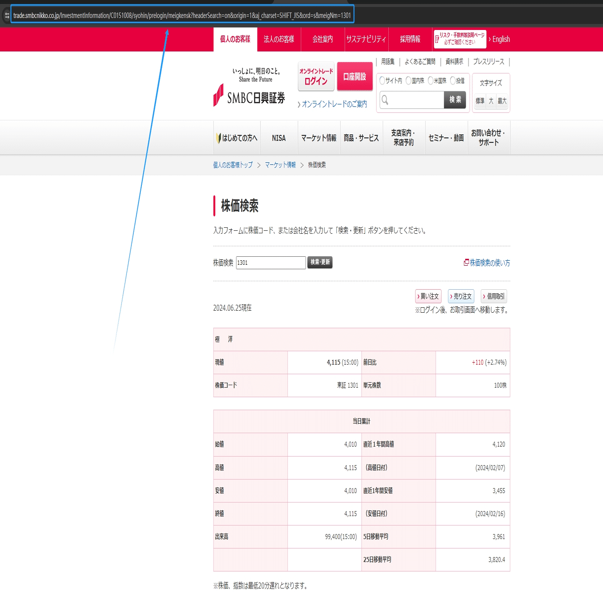 今回は銘柄コードによって株価指数を収得し、そのスクレイピング方法を紹介します。まず、検索結果ページのリンクをコピーしてください。