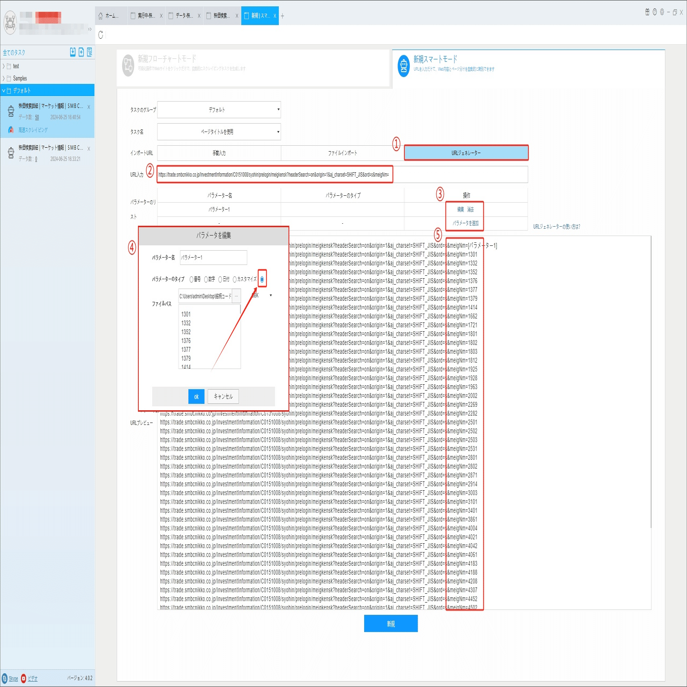 URLジェネレータでURLを入力して、パラメーターを追加画面にファイルから銘柄コードを読み込みます。生成したURLはプレビュー画面でチェックしてください。
