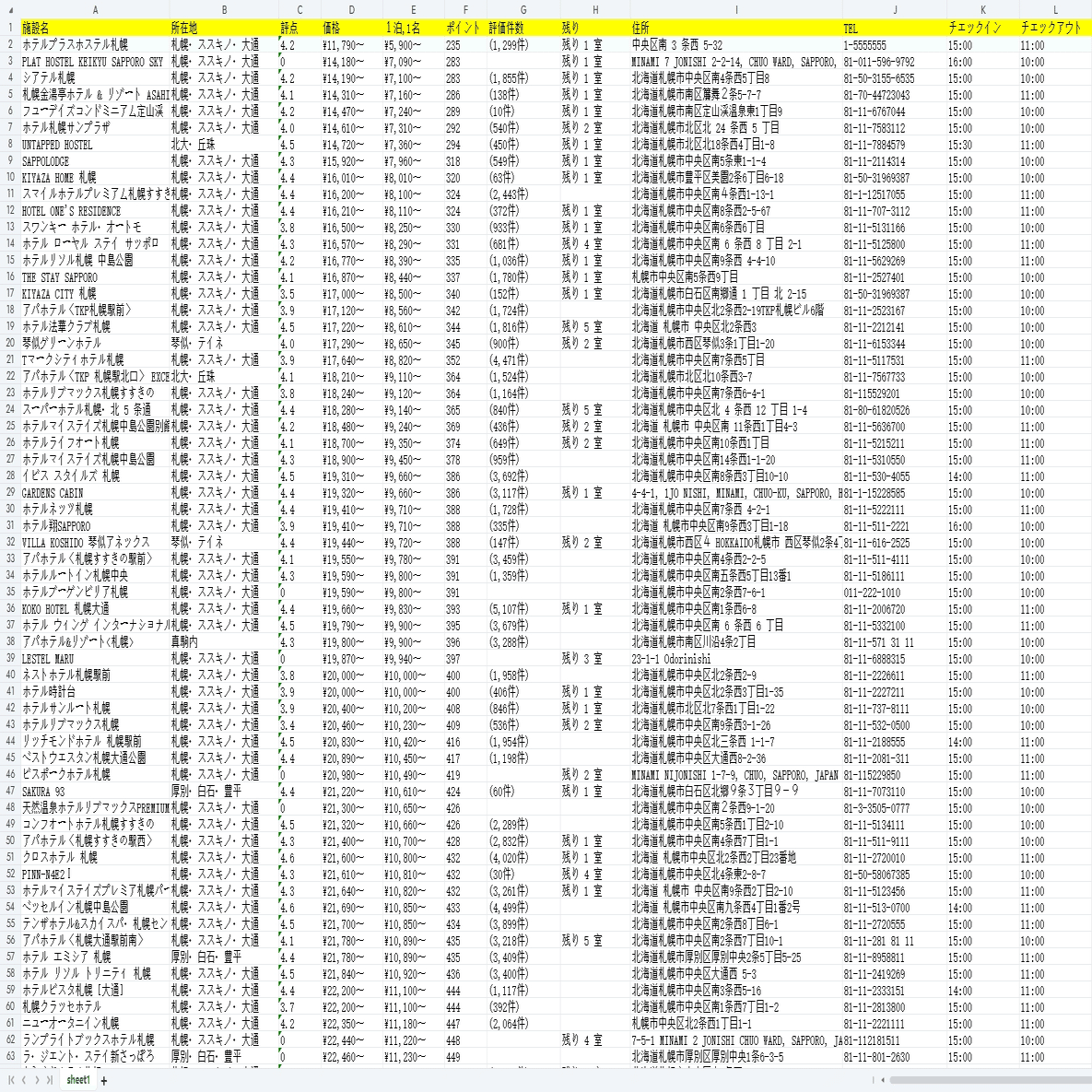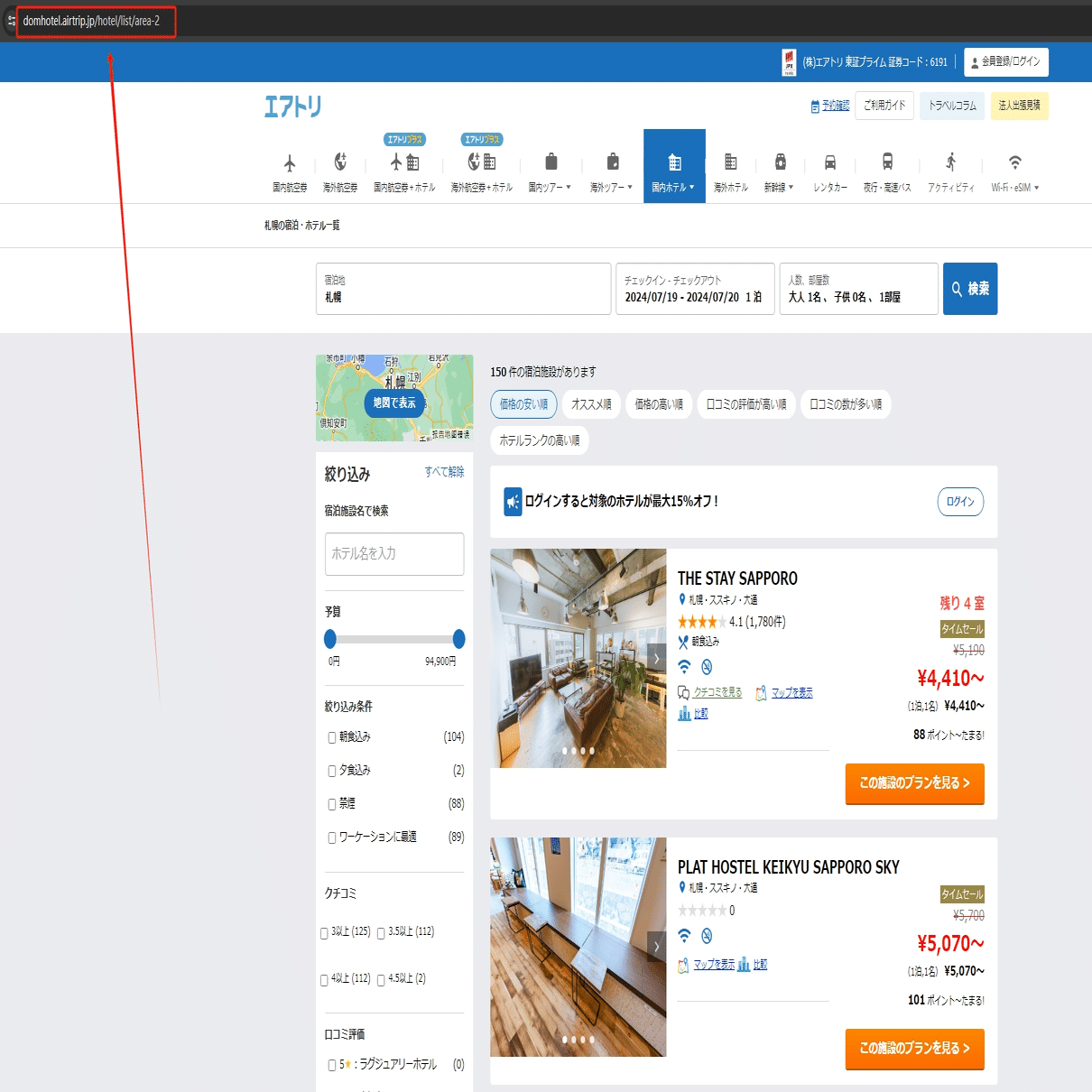 今回は札幌の宿泊・ホテル一覧ページをスクレイピングする方法を紹介します。まず、URLをコピーしてください。
