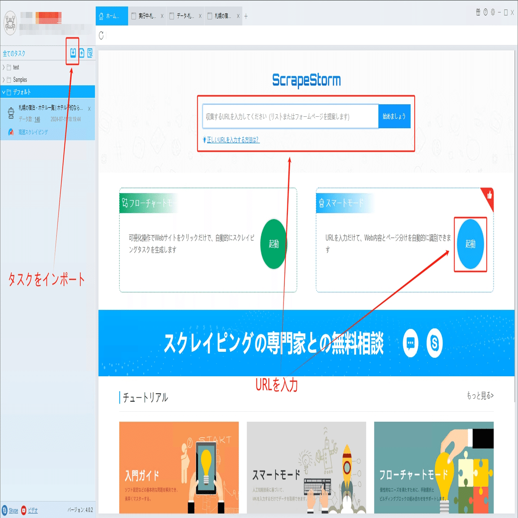 ScrapeStormのホームページ画面にスマートモードタスクを新規作成します。また、持っているタスクをインポートすることもできます。