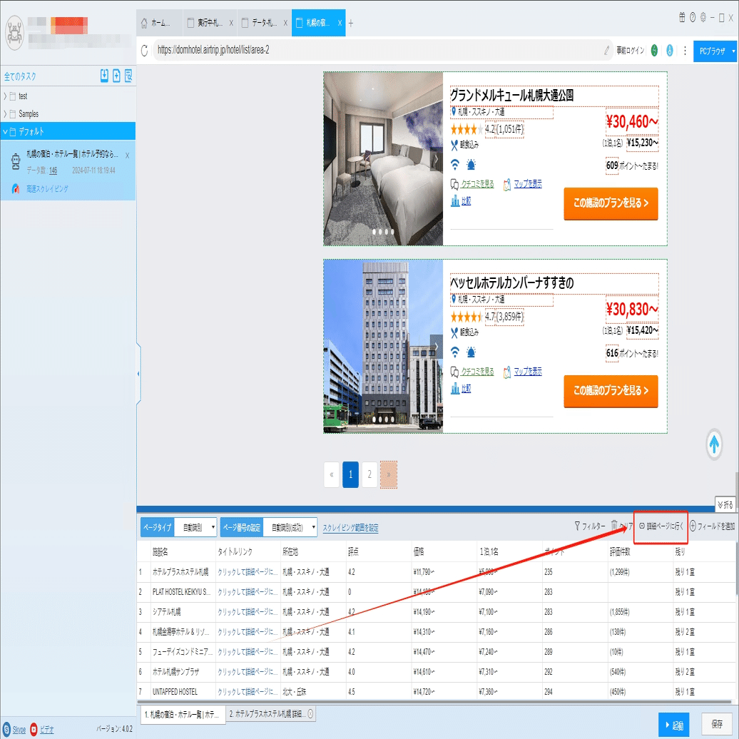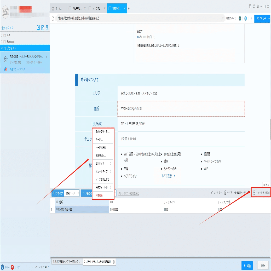 ソフトウェアの「詳細ページに行く」機能を利用し、チェックイン/チェックアウト時間、電話番号、住所などの情報を抽出します。