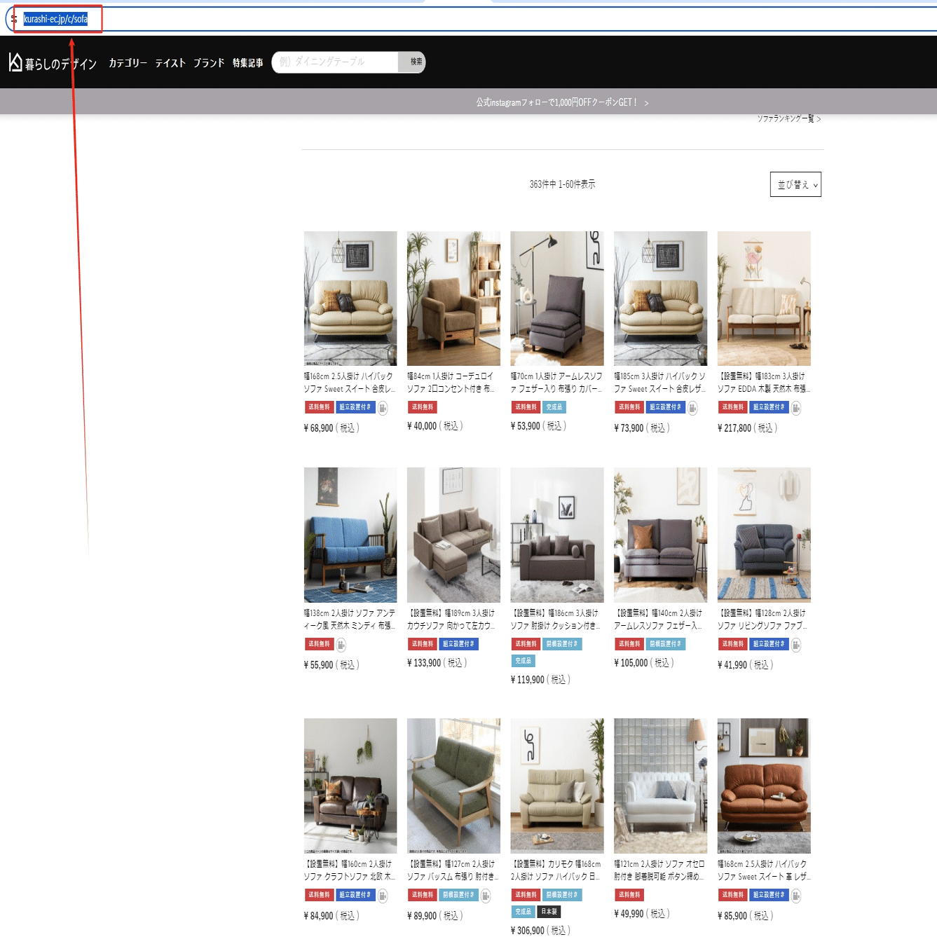 今回はソファの検索結果一覧ページをスクレイピングする方法を紹介します。まず、URLをコピーしてください。