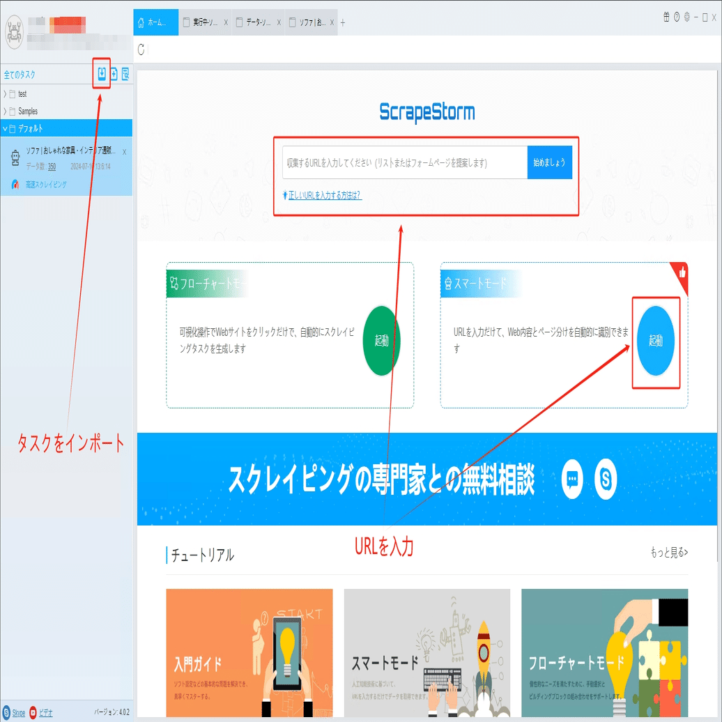 ScrapeStormのホームページ画面にスマートモードタスクを新規作成します。また、持っているタスクをインポートすることもできます。