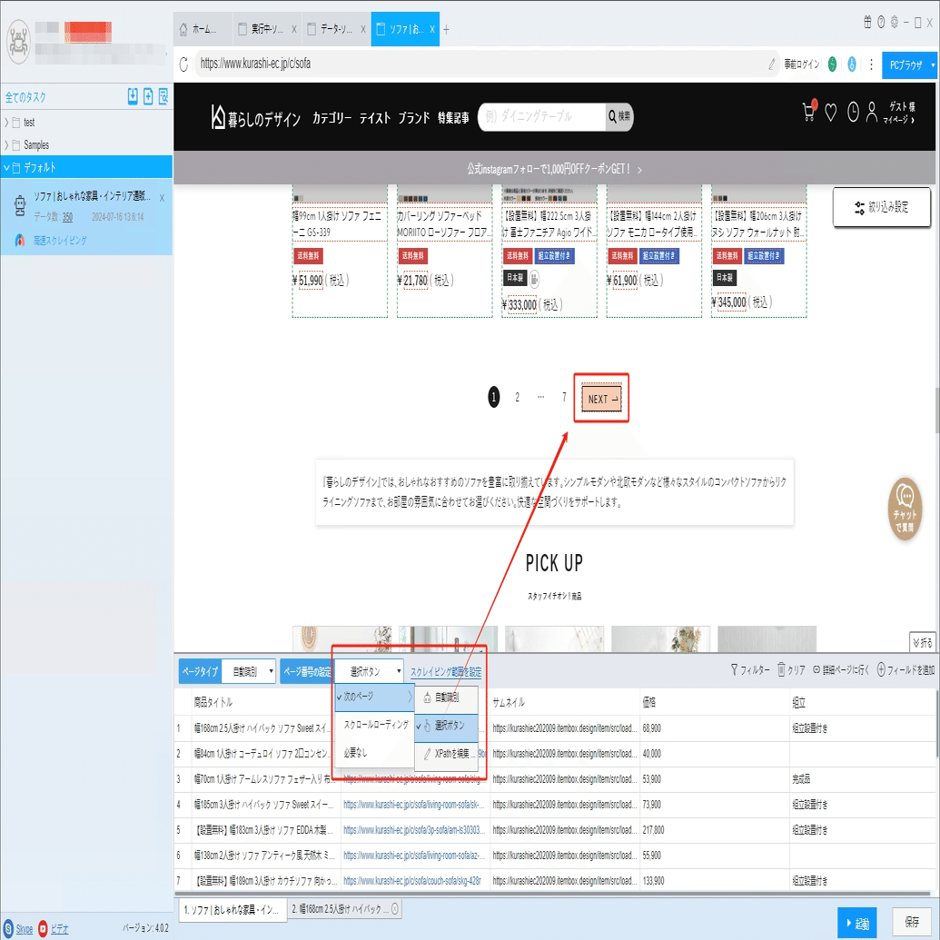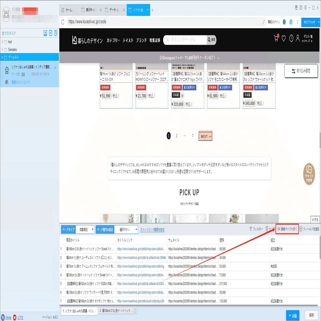 ソフトウェアの「詳細ページに行く」機能を利用し、商品の材質、サイズ、商品詳細などの情報を抽出します。