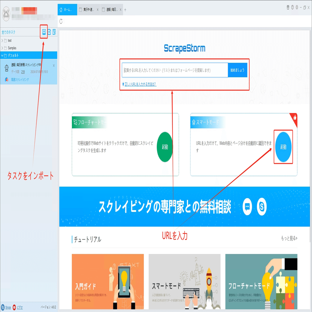 ScrapeStormのホームページ画面にスマートモードタスクを新規作成します。また、持っているタスクをインポートすることもできます。