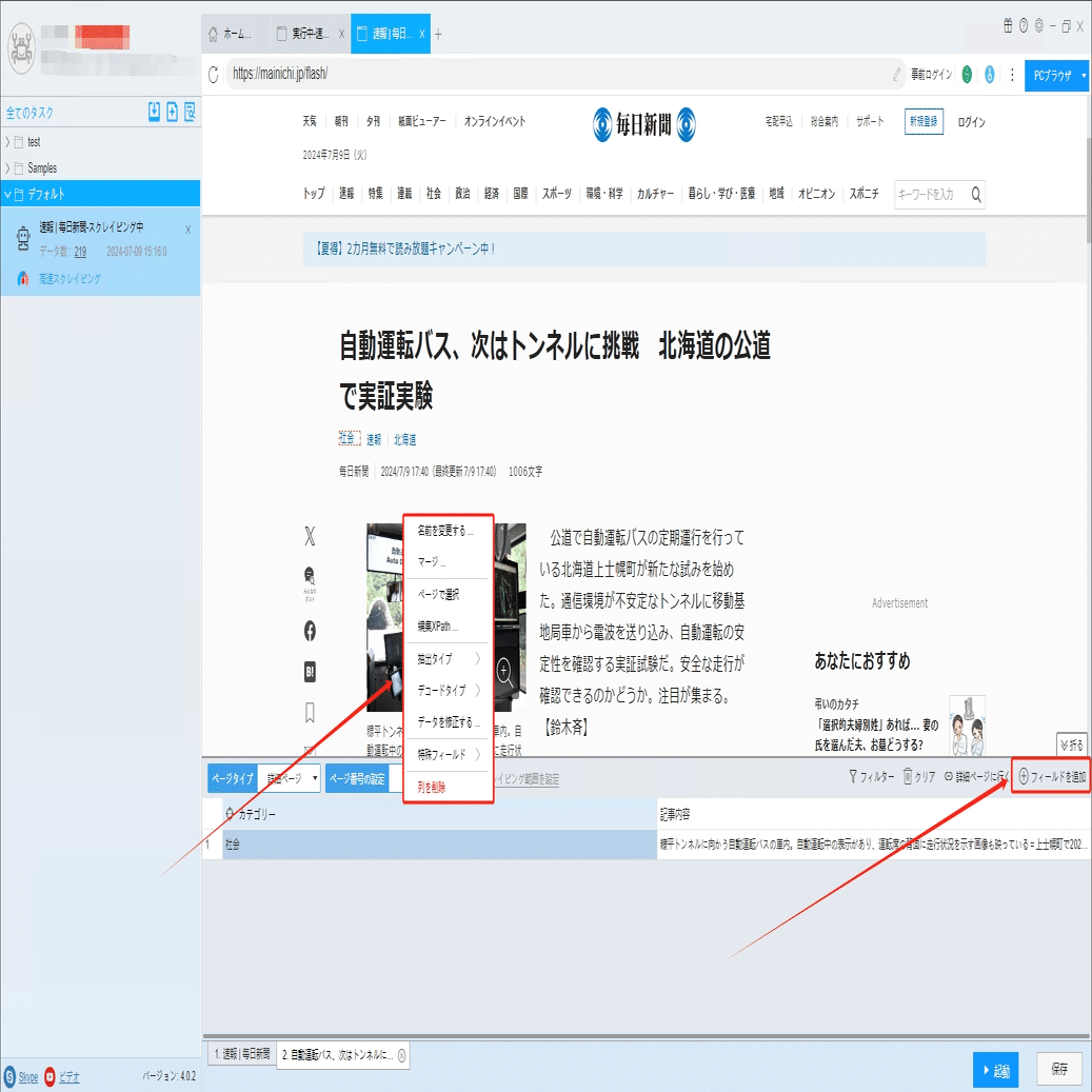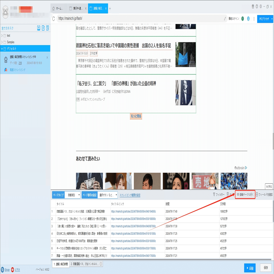 ソフトウェアの「詳細ページに行く」機能を利用し、カテゴリー、記事内容などの情報を抽出します。