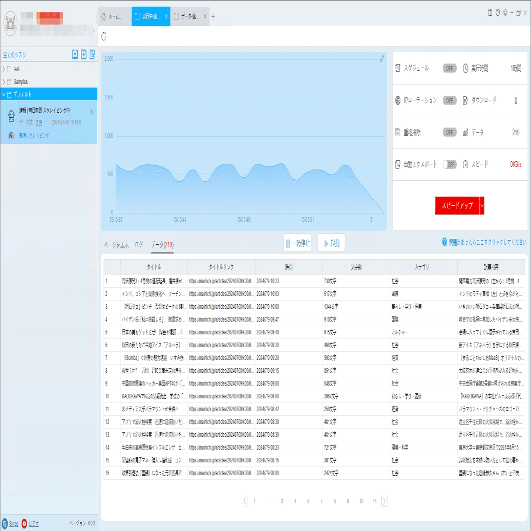 必要に応じて、スケジュール、アンチブロック、自動エクスポート、写真のダウンロード、スピードブーストを設定できます。サーバーに負荷しないように、遅延時間を設定してください。5秒以上を推薦します。スクレイピングタスクを配置する方法については、下記のチュートリアルをご参照ください。