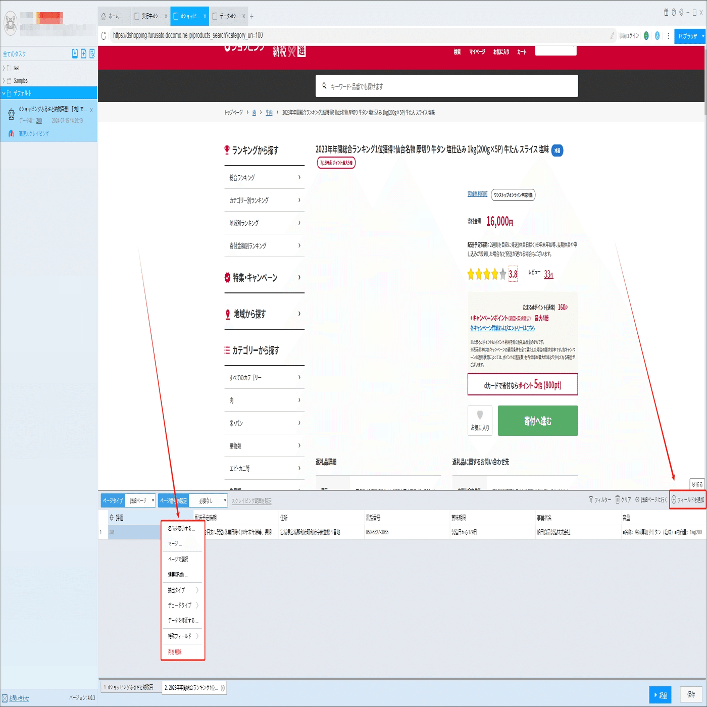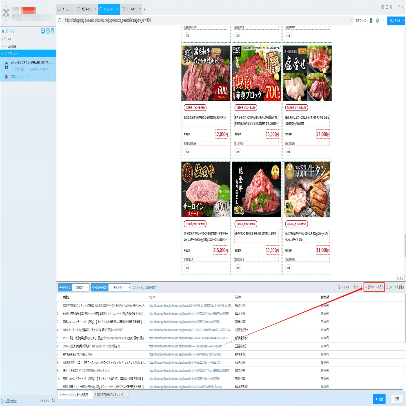 ソフトウェアの「詳細ページに行く」機能を利用し、商品の容量、電話番号、住所などの情報を抽出します。