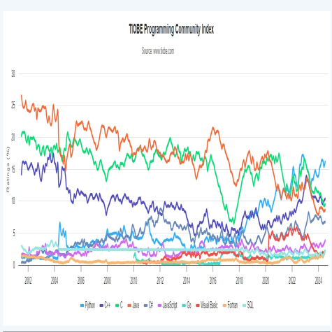トップ 10 プログラミング言語 TIOBE インデックスの傾向 (2002-2024)