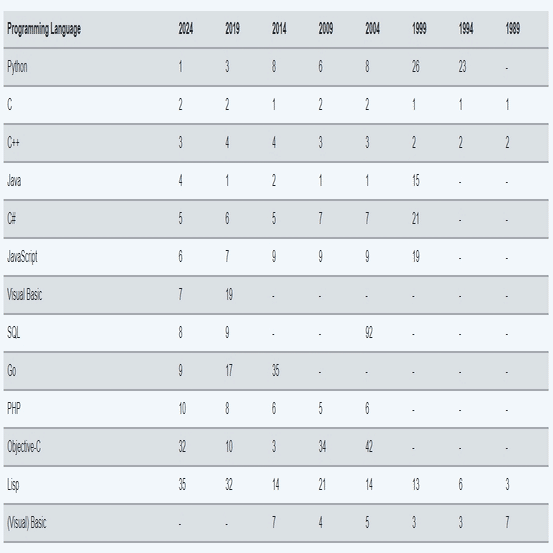 全体を把握するには、数年前の上位 10 のプログラミング言語の順位を以下で確認してください。これらは 12 か月間の平均順位であることに注意してください。