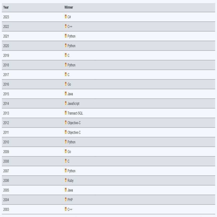 「今年のプログラミング言語」賞の受賞者全員をリストした殿堂を以下に示します。この賞は、1 年間で評価が最も上昇したプログラミング言語に与えられます。