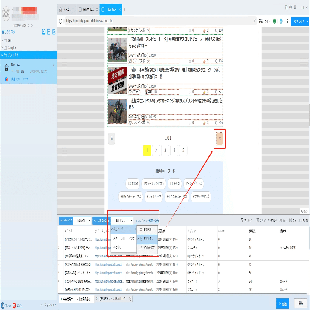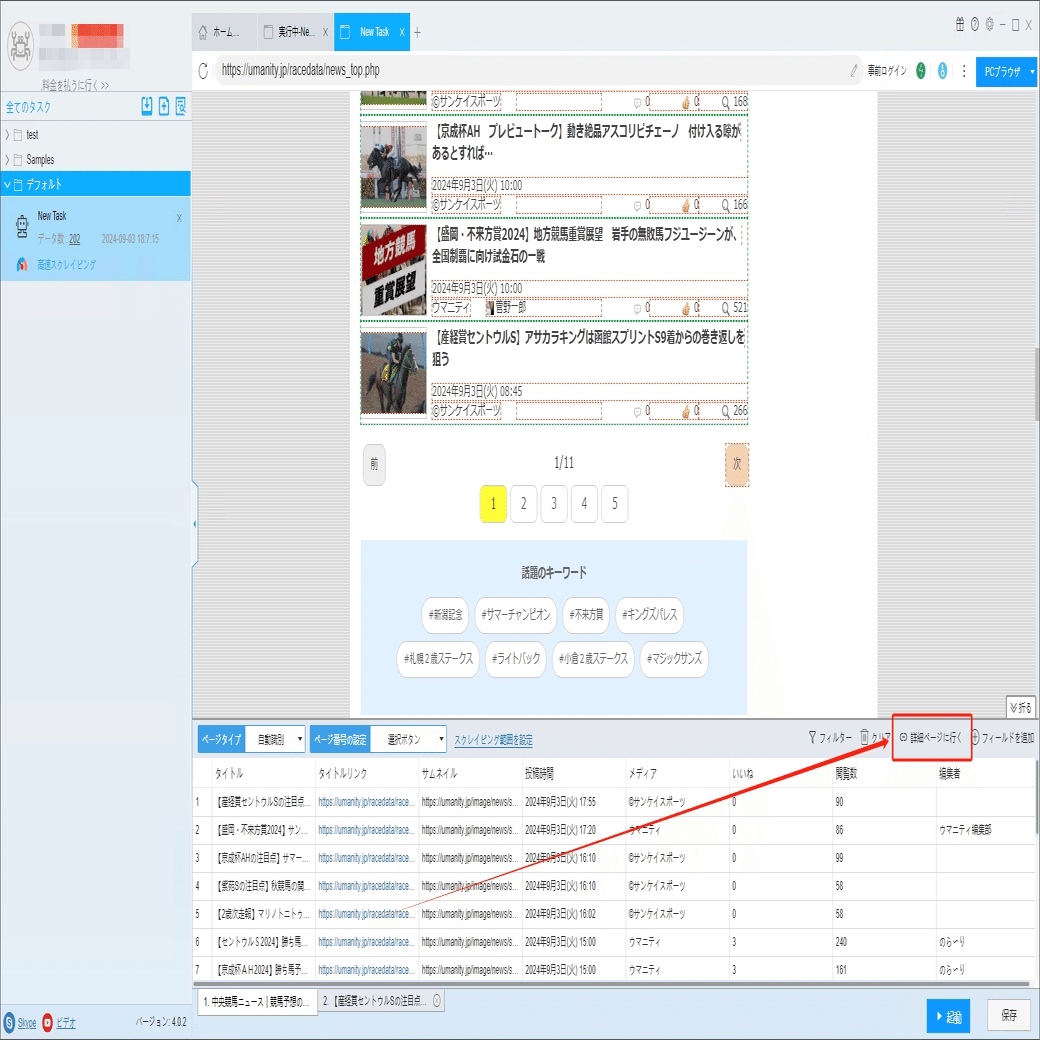 ソフトウェアの「詳細ページに行く」機能を利用し、ニュース記事を抽出します。