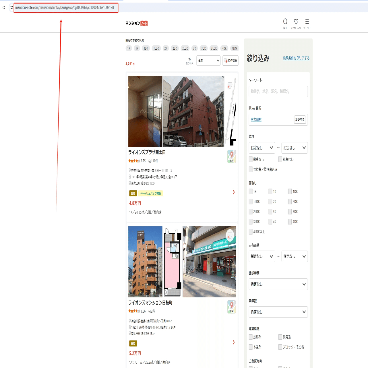 今回は南太田駅の賃貸マンション一覧ページをスクレイピングする方法を紹介します。まず、URLをコピーしてください。