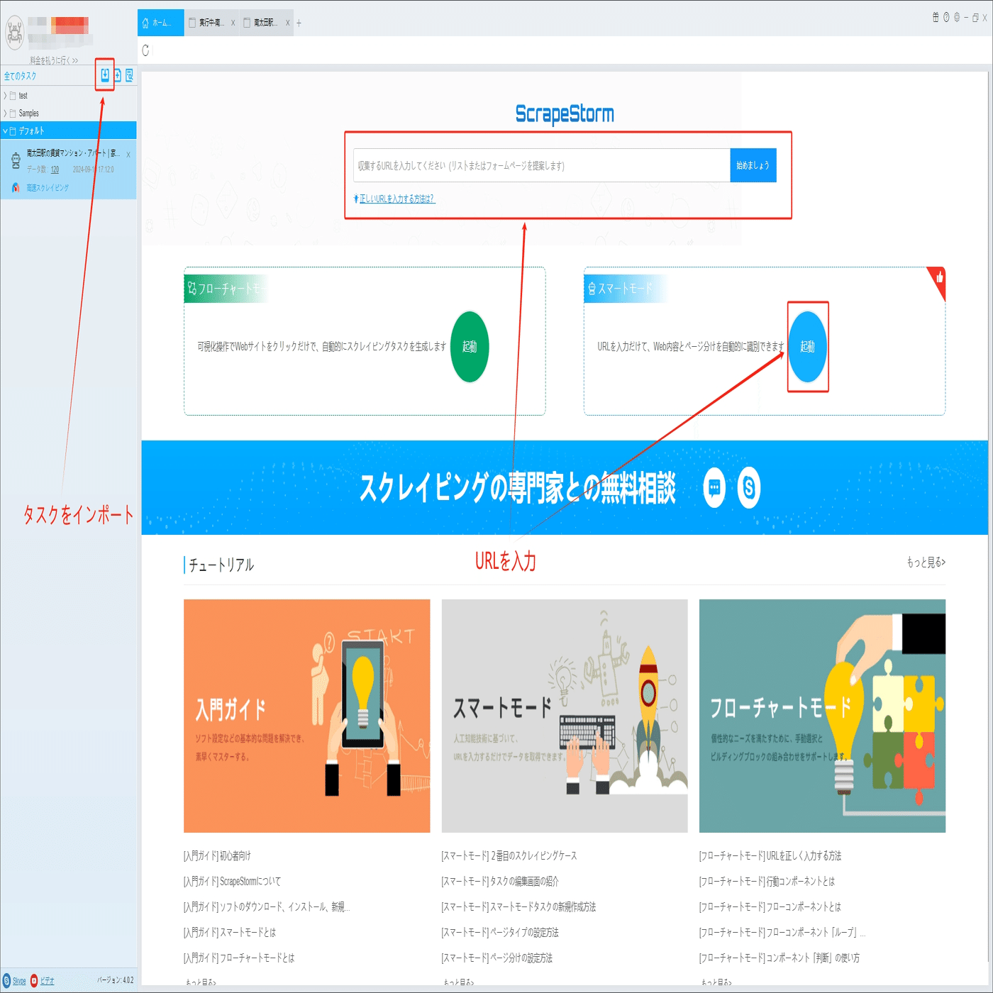 ScrapeStormのホームページ画面にスマートモードタスクを新規作成します。また、持っているタスクをインポートすることもできます。