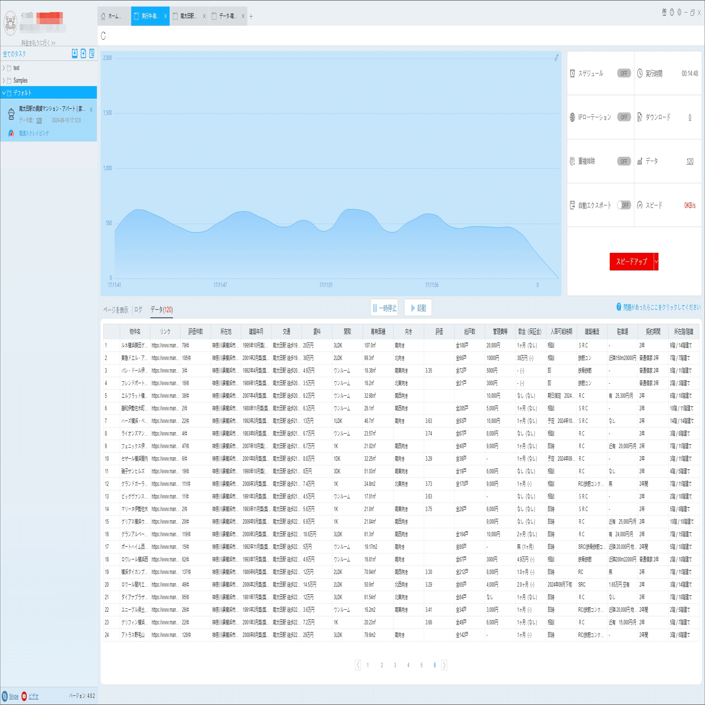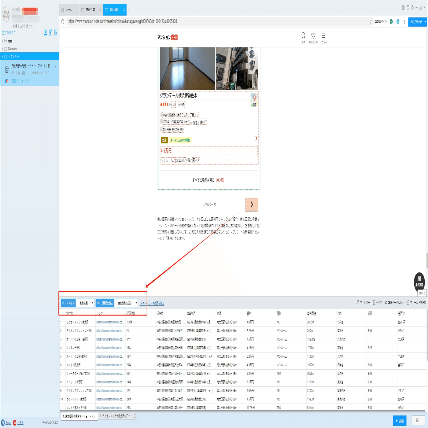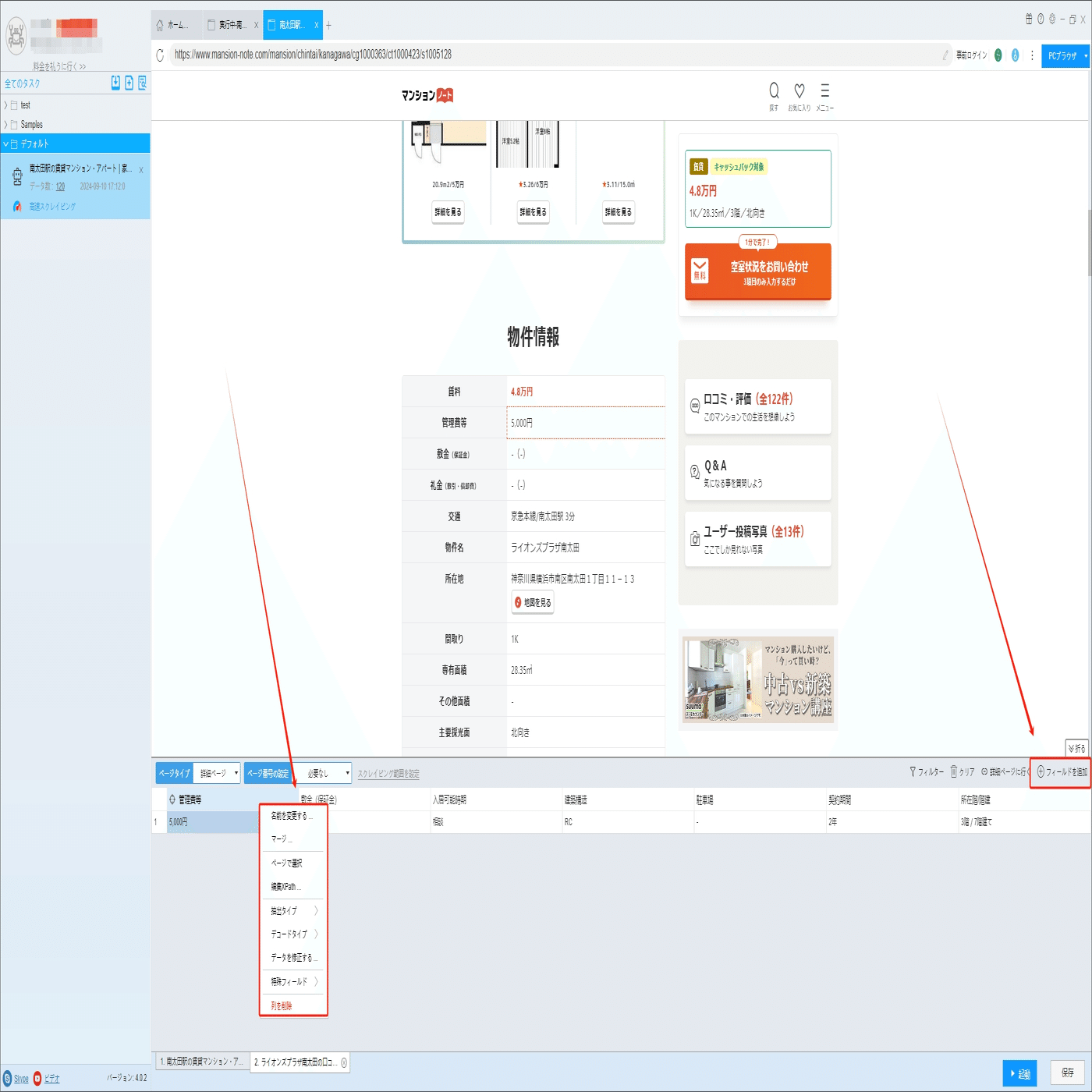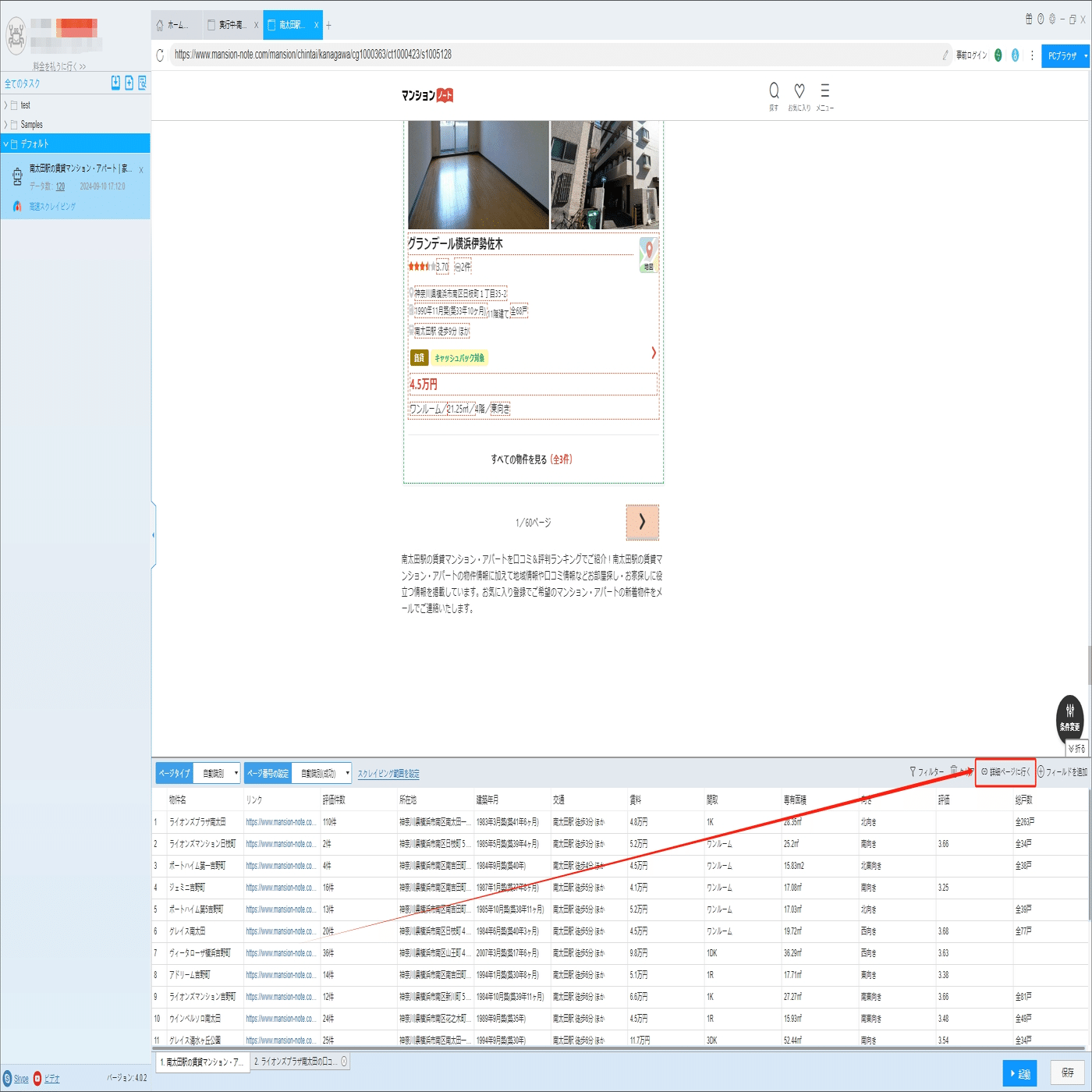 ソフトウェアの「詳細ページに行く」機能を利用し、管理費、駐車場、入居可能時期などの情報を抽出します。