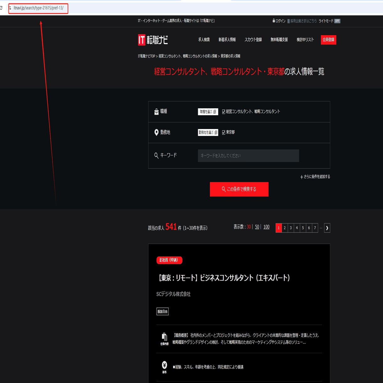今回は経営コンサルタント、戦略コンサルタント・東京都の求人情報一覧ページを例として、そのスクレイピング方法を紹介します。まず、URLをコピーしてください。