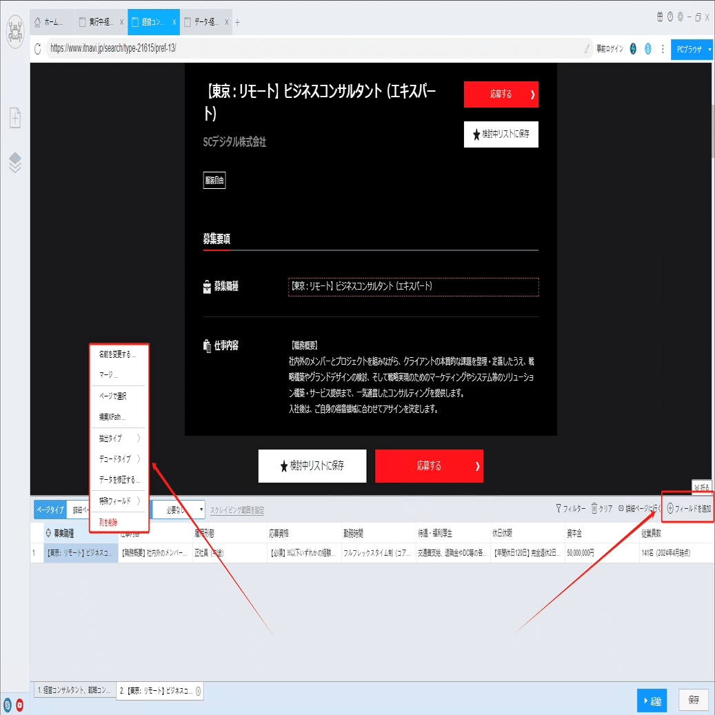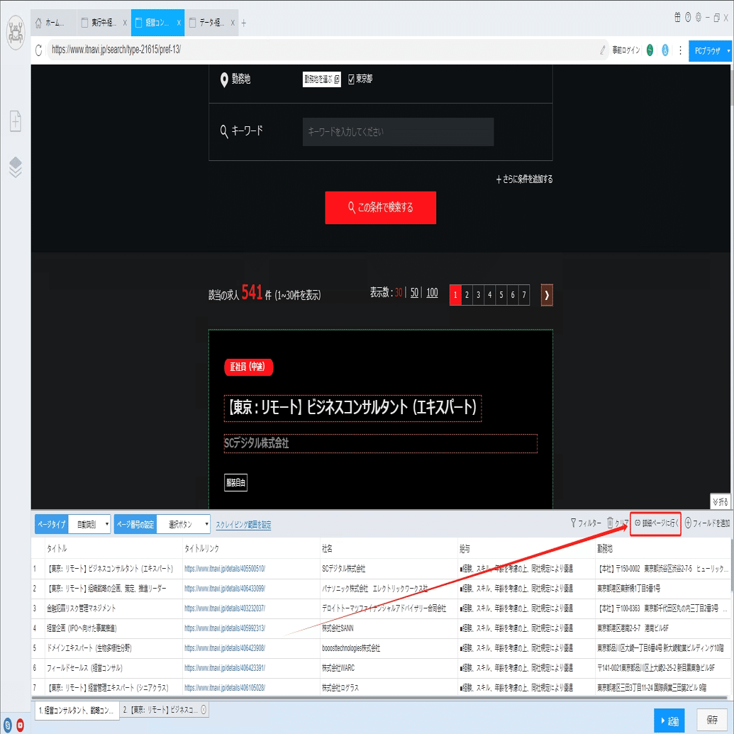 ソフトウェアの「詳細ページに行く」機能を利用し、応募資格、休日休暇、待遇福利厚生などの情報を抽出します。