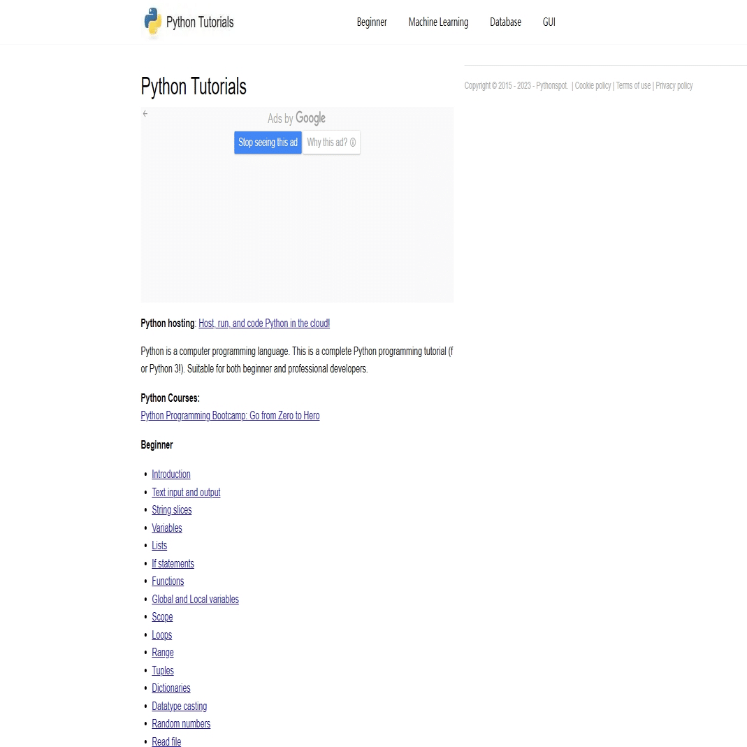 まず、Python初心者にはPythonspotが最適な出発点です。このプラットフォームは多くの無料チュートリアルを提供しており、内容は難易度に応じて整理されています。そのため、初級の概念から高度なトピックへとスムーズに移行できます。Pythonspotのコースデザインは、初心者が段階的にPythonプログラミングの理解を深められるよう工夫されています。