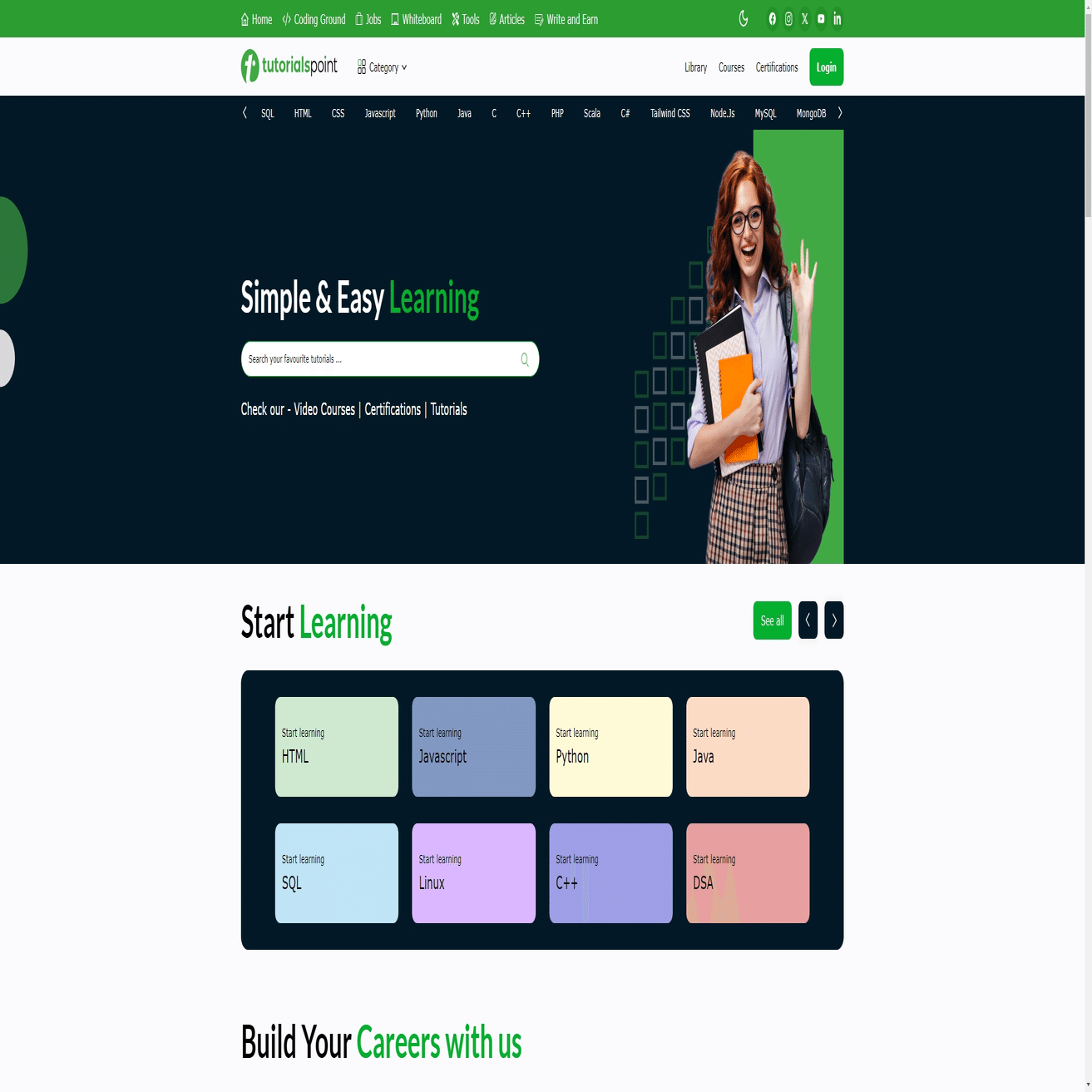 実践を通じて学びたい初心者にとって、Tutorials Pointは優れたプラットフォームです。豊富な練習問題やコーディングオプションを提供しており、プロフェッショナルもスキルを磨く機会を得られます。Tutorials Pointのコース構成は、実際の操作を通じて学習内容をテストし、確実に定着させることができます。