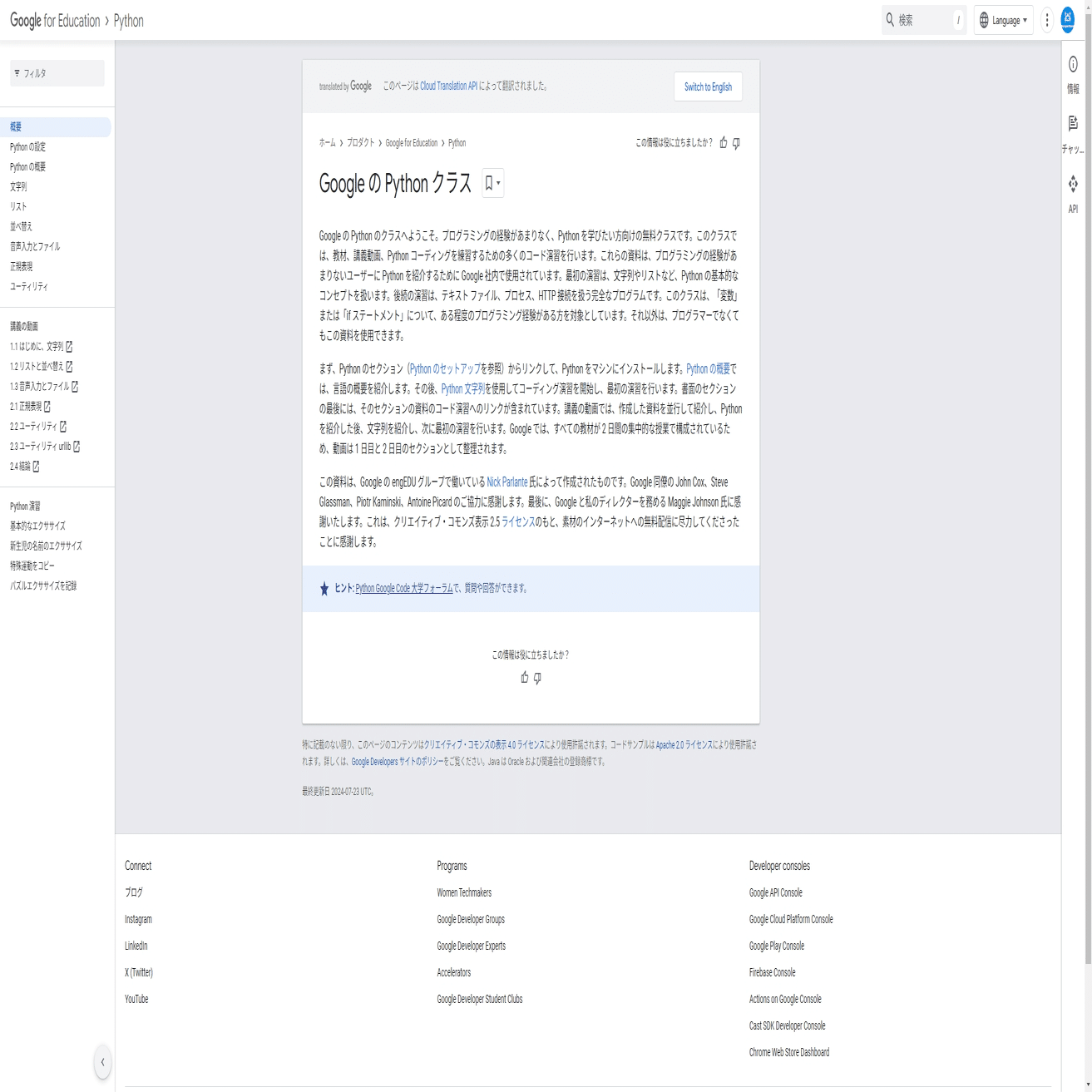 電子書籍で学習するのが好きな人には、GoogleのPythonクラス電子書籍がオススメです。このコースは理論的な概念に重点を置き、基本的な概念を組織的に紹介しています。書籍の内容に加えて、Googleは講義動画や実践課題も提供しており、学んだ知識をさらに理解し応用するのに役立ちます。