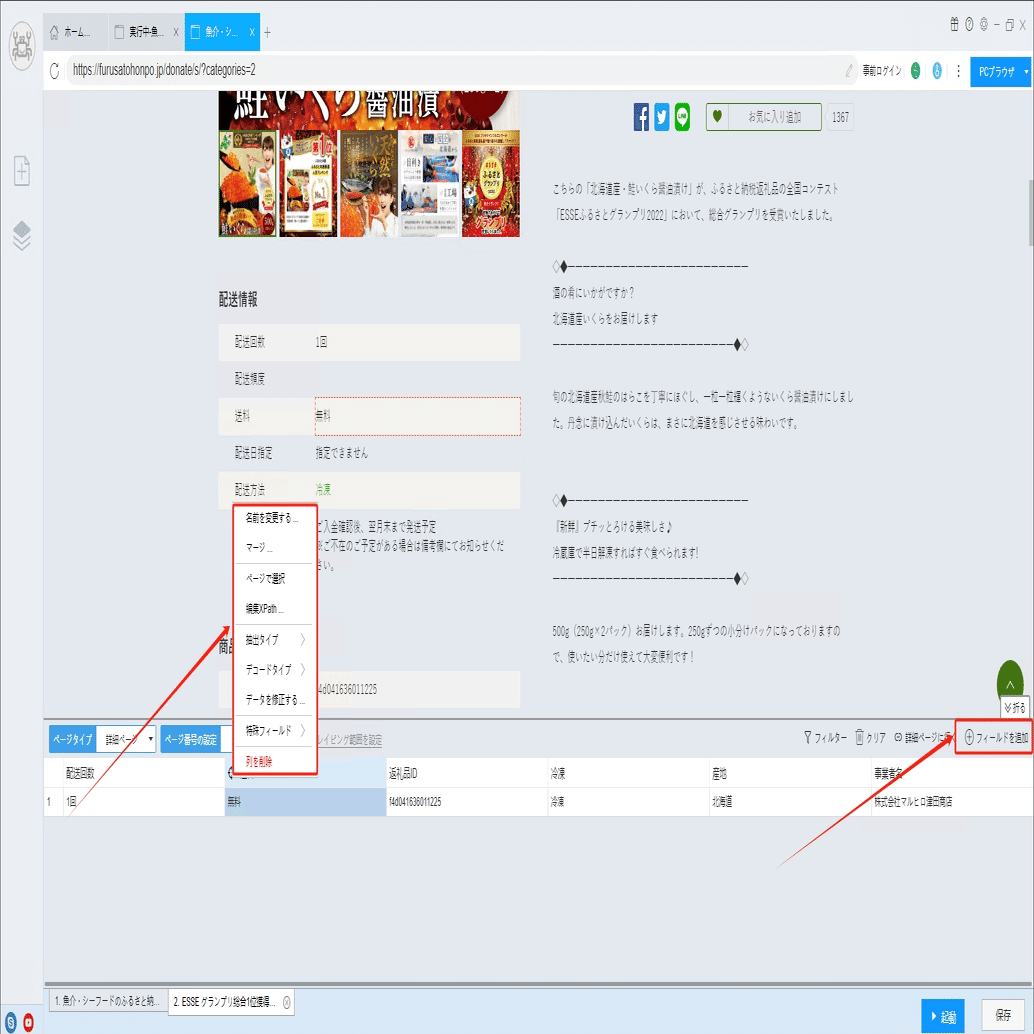 「フィールドを追加」ボタンをクリックして、画面に必要な要素を選択、データが自動的に抽出されます。画像を取得する方法について、全ての画像を選んで、生成されたフィールドを外部HTMLに変更してください。また、必要に応じてフィールドの名前の変更または削除、結合できます。フィールドの設定の詳細には下記のチュートリアルをご参照ください。