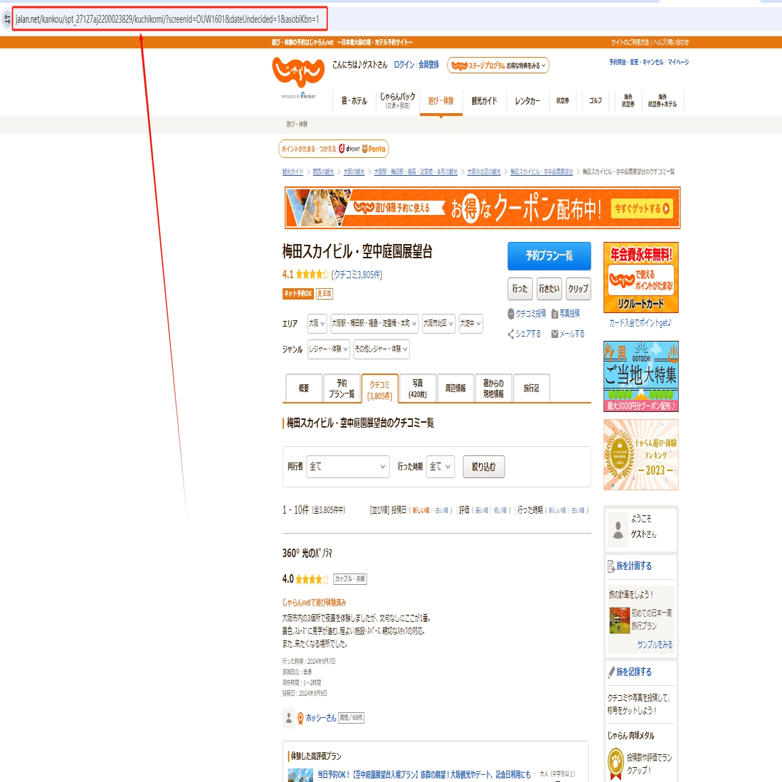 今回はある人気観光地の口コミ一覧ページからコメントを収得し、そのスクレイピング方法を紹介します。まず、URLをコピーしてください。