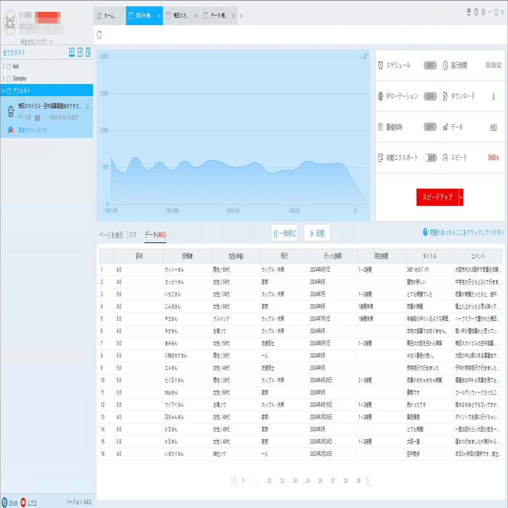 必要に応じて、スケジュール、アンチブロック、自動エクスポート、写真のダウンロード、スピードブーストを設定できます。サーバーに負荷しないように、遅延時間を設定してください。5秒以上を推薦します。スクレイピングタスクを配置する方法については、下記のチュートリアルをご参照ください。