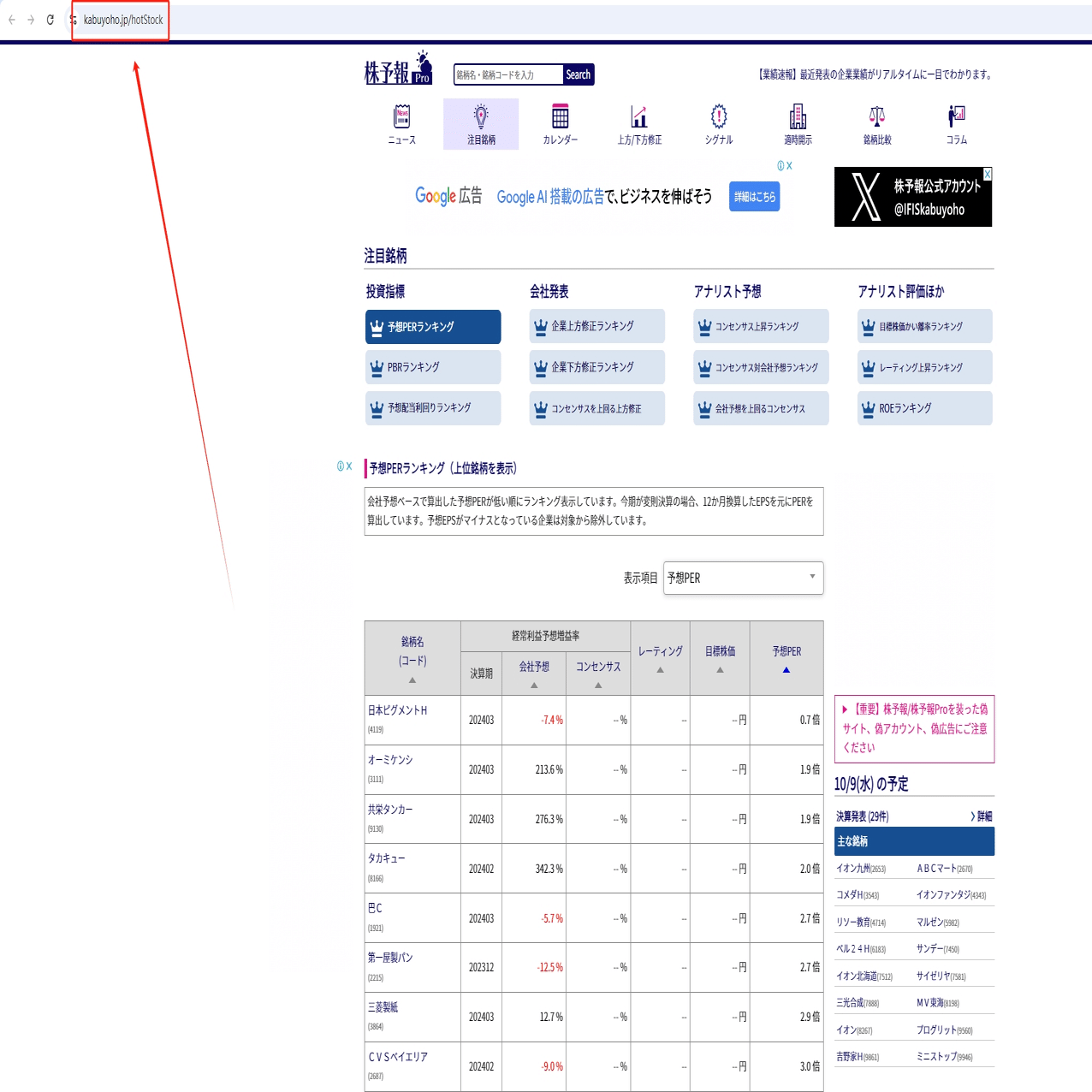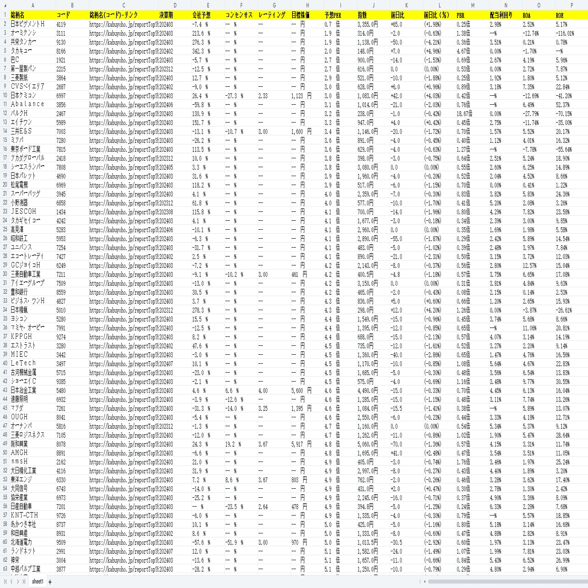 今回は予想PERランキング(上位銘柄を表示)ページから株価の情報を収得し、そのスクレイピング方法を紹介します。まず、URLをコピーしてください。